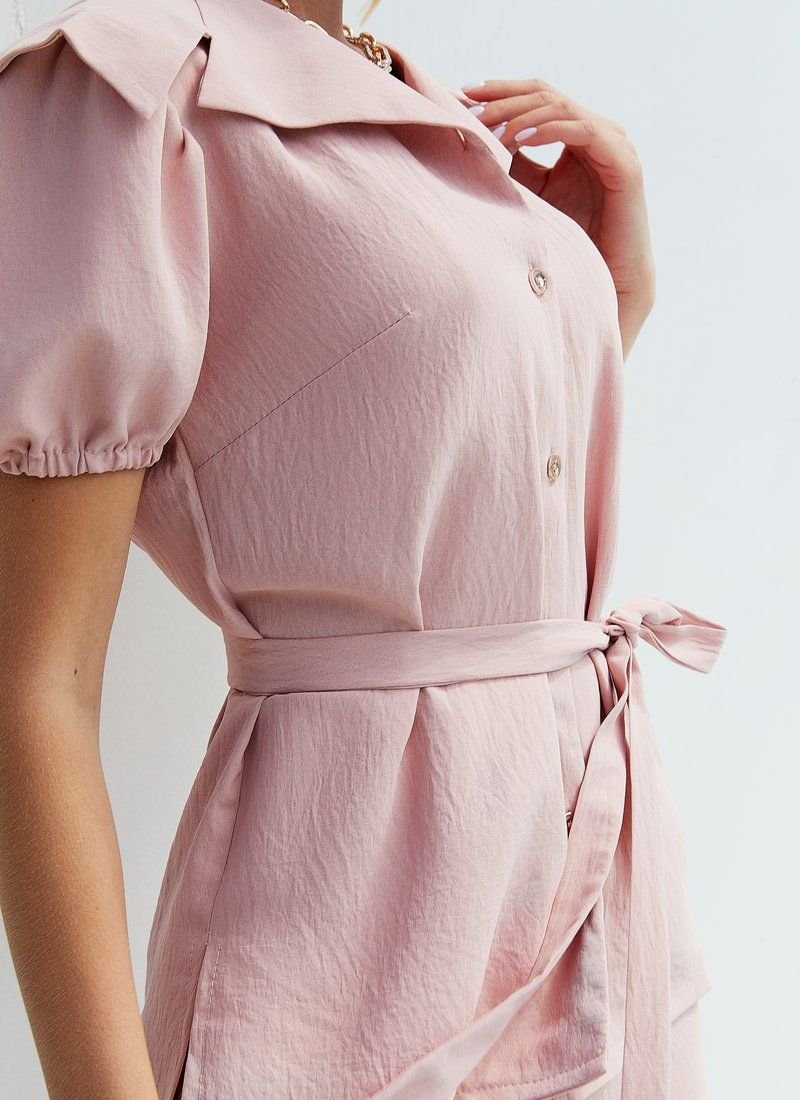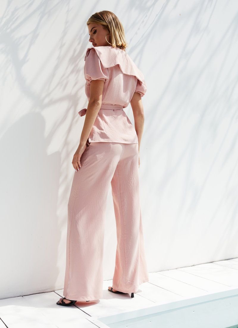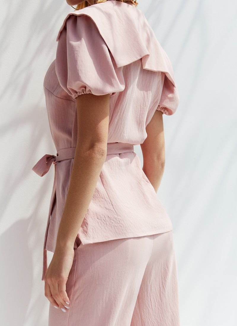 The pink suit with flared trousers and shirt is made of a material that has a light texture. The top was complemented with short lantern sleeves and side slits. Trousers with an inflated fit accentuate the waist. The kit includes a belt.
