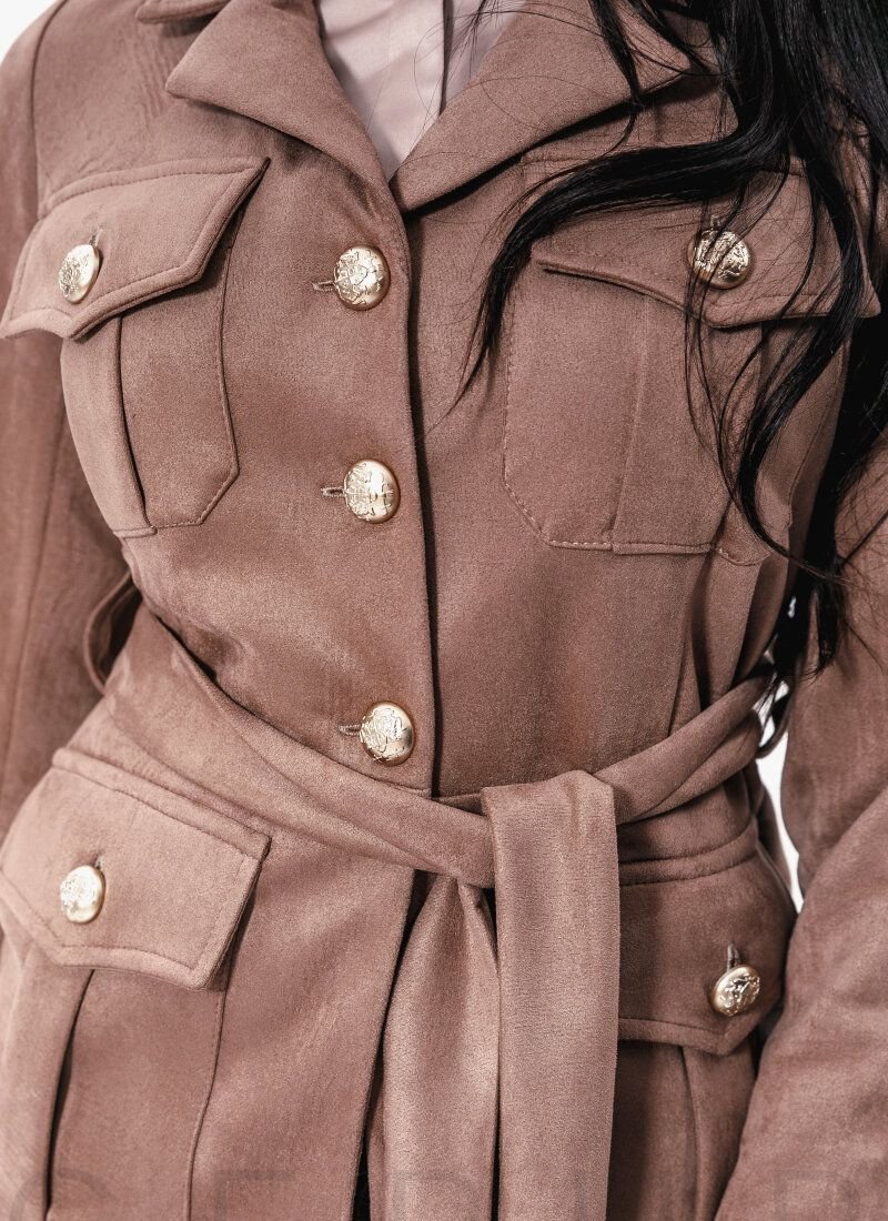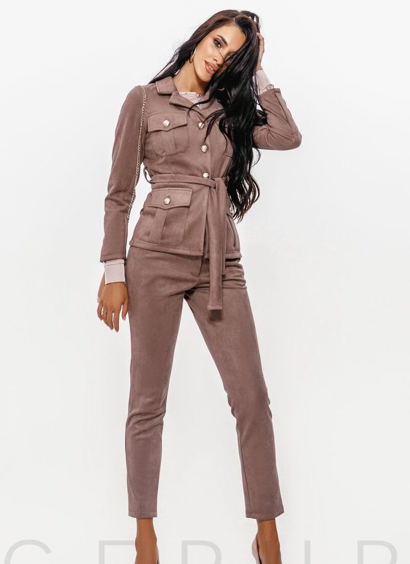 trendy suit made of soft eco-suede in a chocolate shade: a jacket with a turn-down collar, lapels, long sleeves, contrasting massive buttons and patch pockets with a flap, complemented by a removable plain belt, medium-fit trousers with zips and two welt pockets. ..