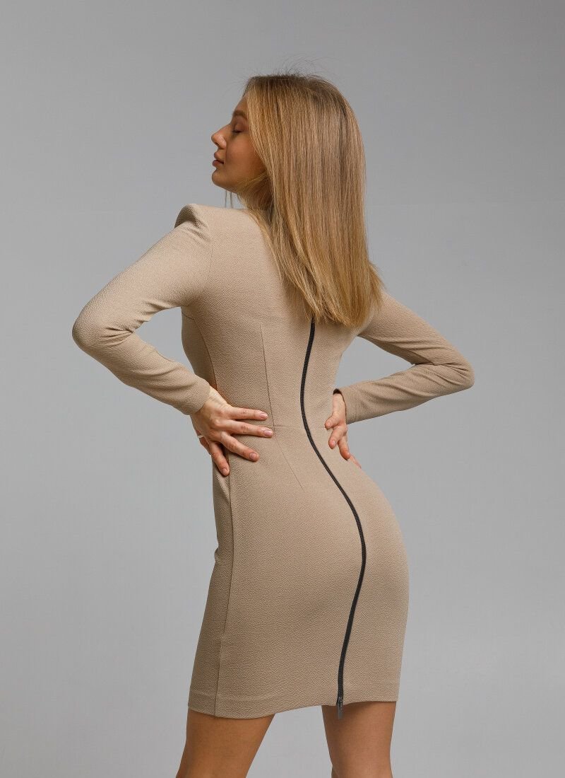 Beige color, laconic cut and long sleeves: the dress made of soft elastic fabric looks as restrained as possible. The whole semantic load is assumed by the curly neckline. The model was supplemented with a zipper at the back along the entire length, which serves not only as a fastener, but also acts as a decorative element._x000D_