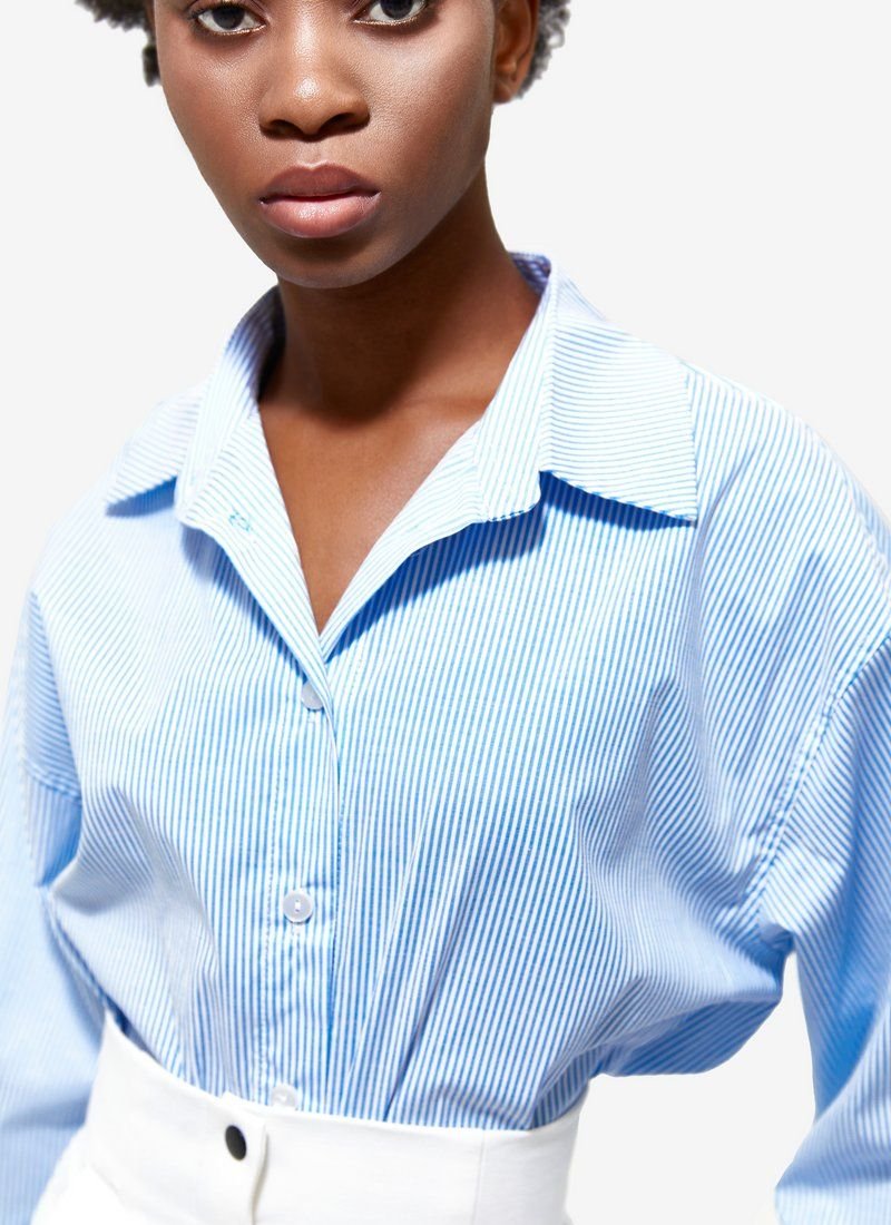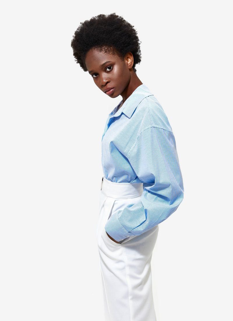 Blue oversize shirt of the classic striped model, with buttons. Long sleeve with wide cuffs. With such a thing in the wardrobe, you can easily make up a lot of options for images.