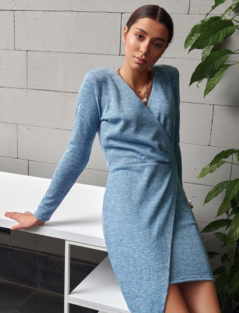A blue mini dress made of soft knitted fabric is not devoid of femininity. The whole semantic load is taken over by a fitted cut with an effect on the smell. A v-neck and an asymmetric bottom complete the look.
