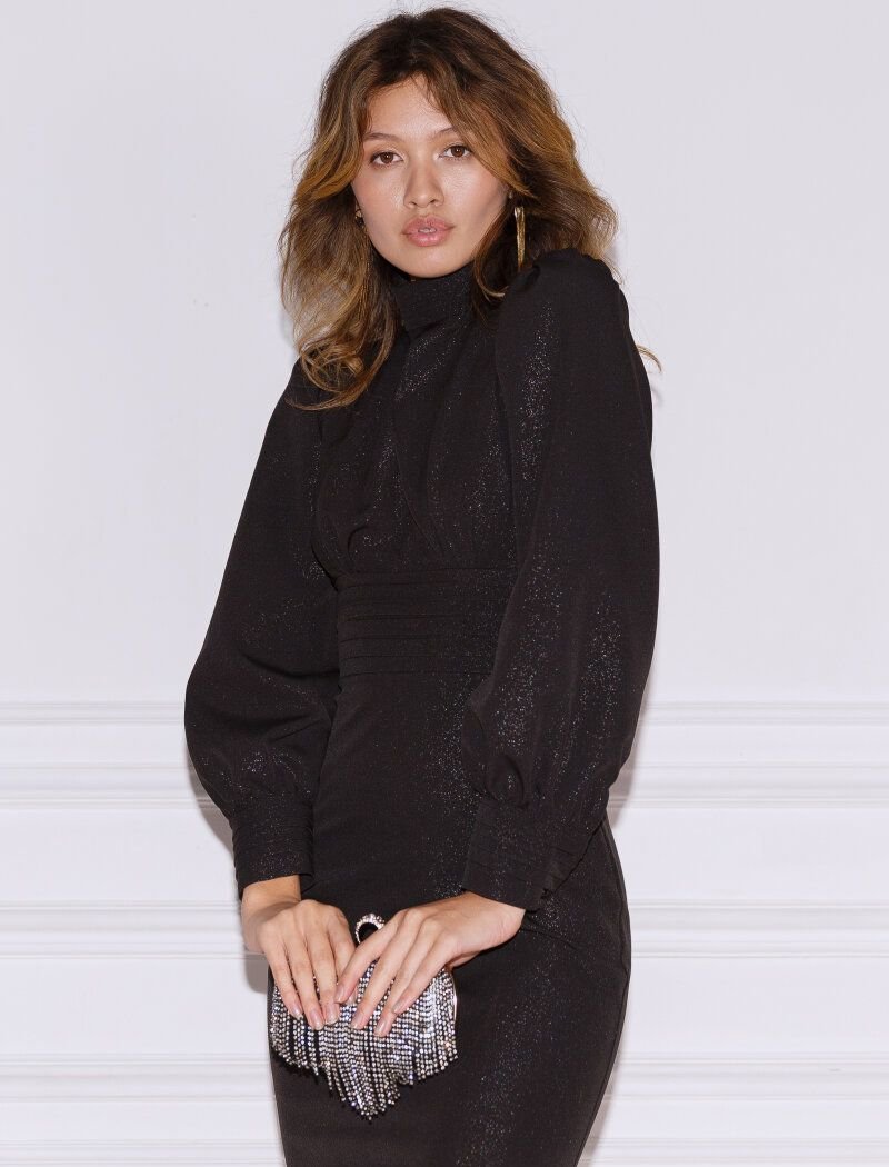This black mini dress will not let you get lost in the crowd. It's all about the original style, complemented by trendy details. The stand-up collar, sleeve cuffs and wide belt are made with pleating, which gives the model a Victorian style. A curly cutout is made on the chest, accentuating the decollete area.