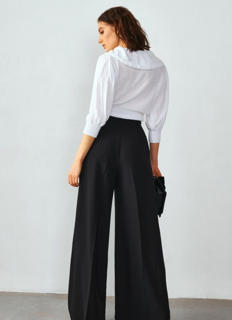 The white jumper with lantern sleeves is made of textured knitted knitwear, which does not look massive. The accent of the model was a large turn-down collar - a trendy detail FW'20/21 according to Vogue. The neckline was also supplemented with a decorative textile bow.