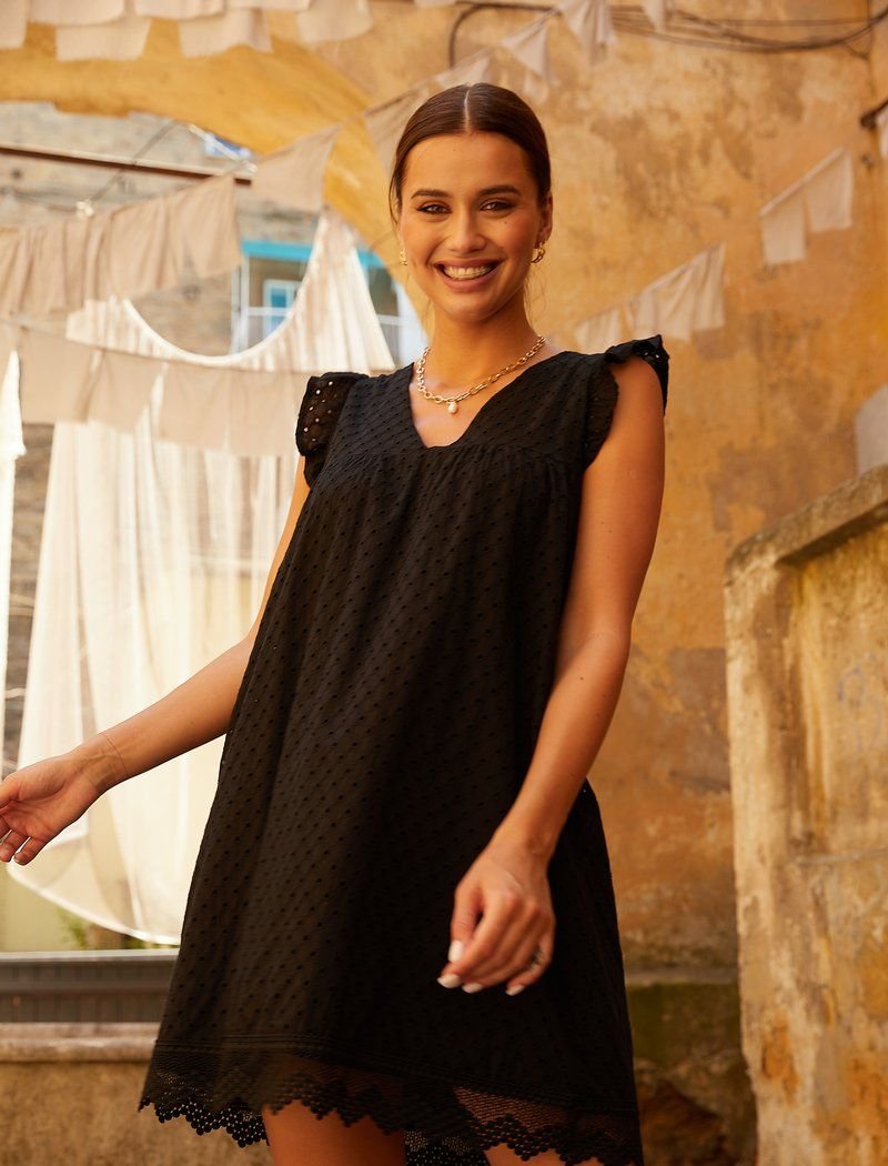 A light, loose-fitting dress made of cotton fabric with floral embroidery. The neat yoke of the dress is decorated with a v-neck and wing sleeves. The dress is complemented by two small pockets in the seams and a lace trim at the hem.