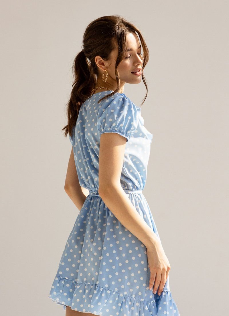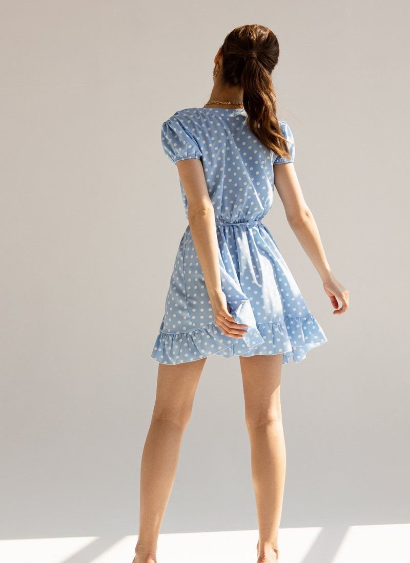 To produce a wow effect, the dress has enough color. The blue shade has acquired a new sound in combination with a universal pea print. The light fabric falls in waves, making the fitted silhouette especially expressive. The designers completed the product with a flounce at the hem and ruffles at the neckline area.