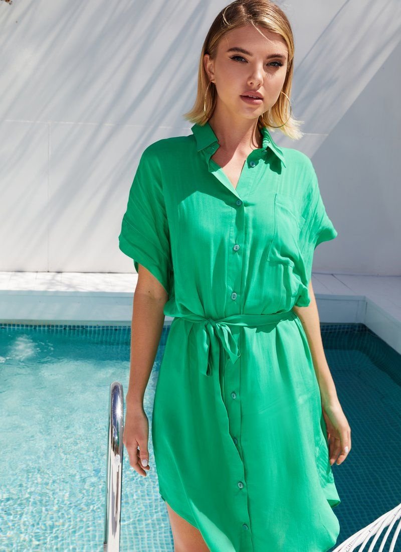 With all the minimalistic design, the shirt dress does not look simple. The mood was set with the help of a rich green shade. Light cotton with the addition of synthetic threads was chosen for sewing the model. The waistline was accentuated with a belt-ribbon.