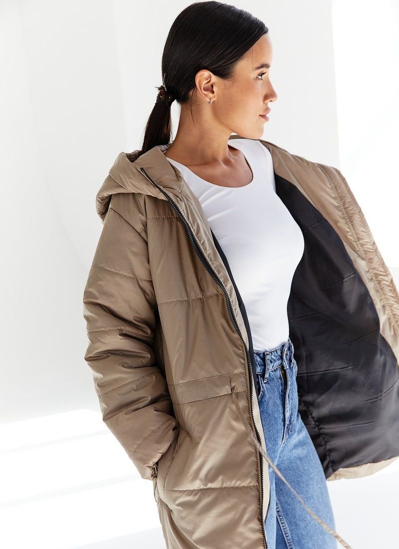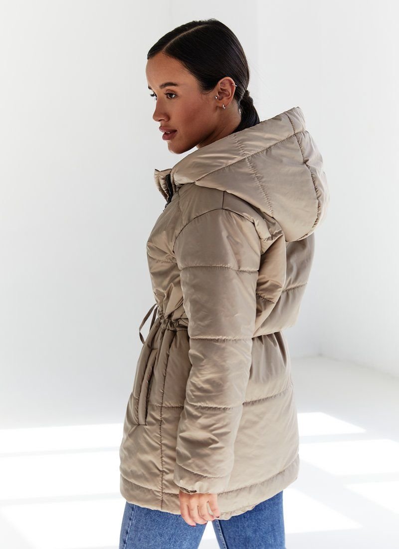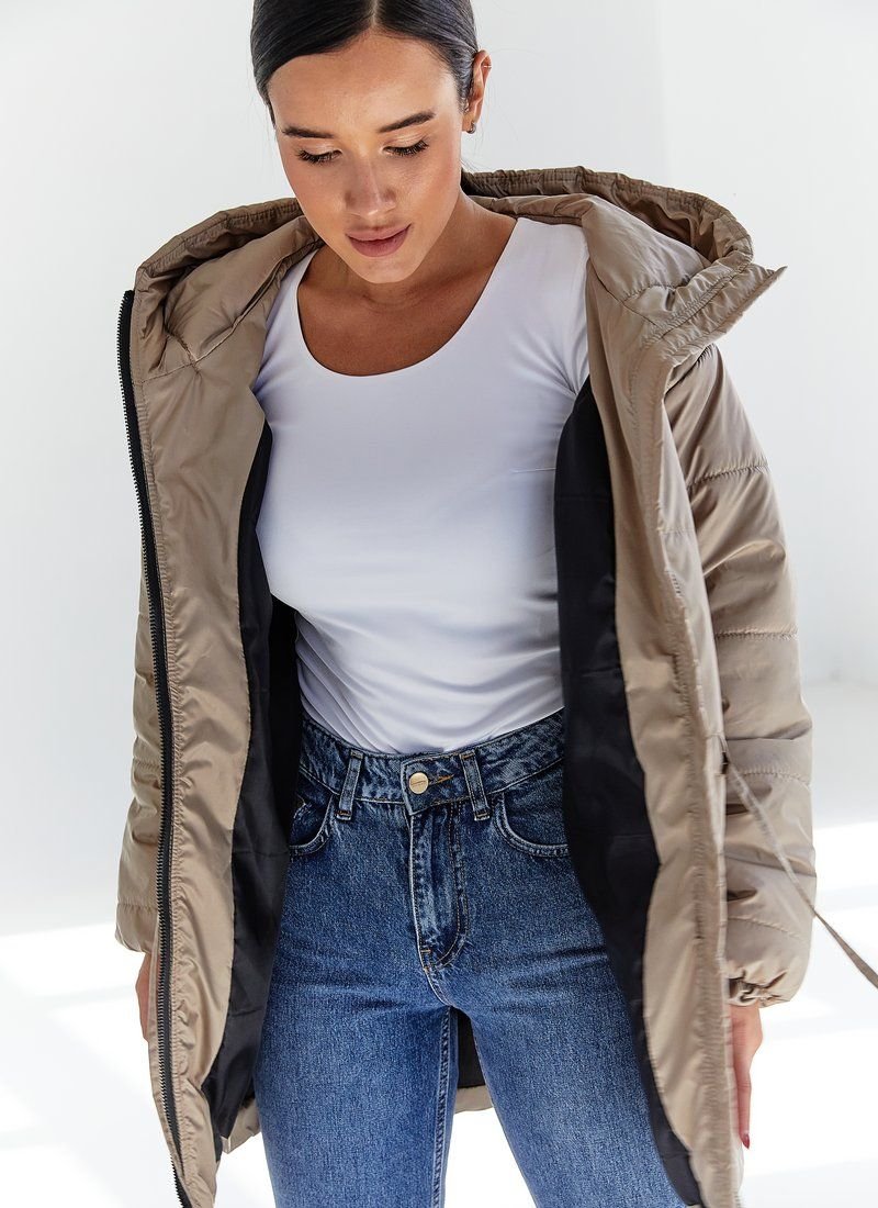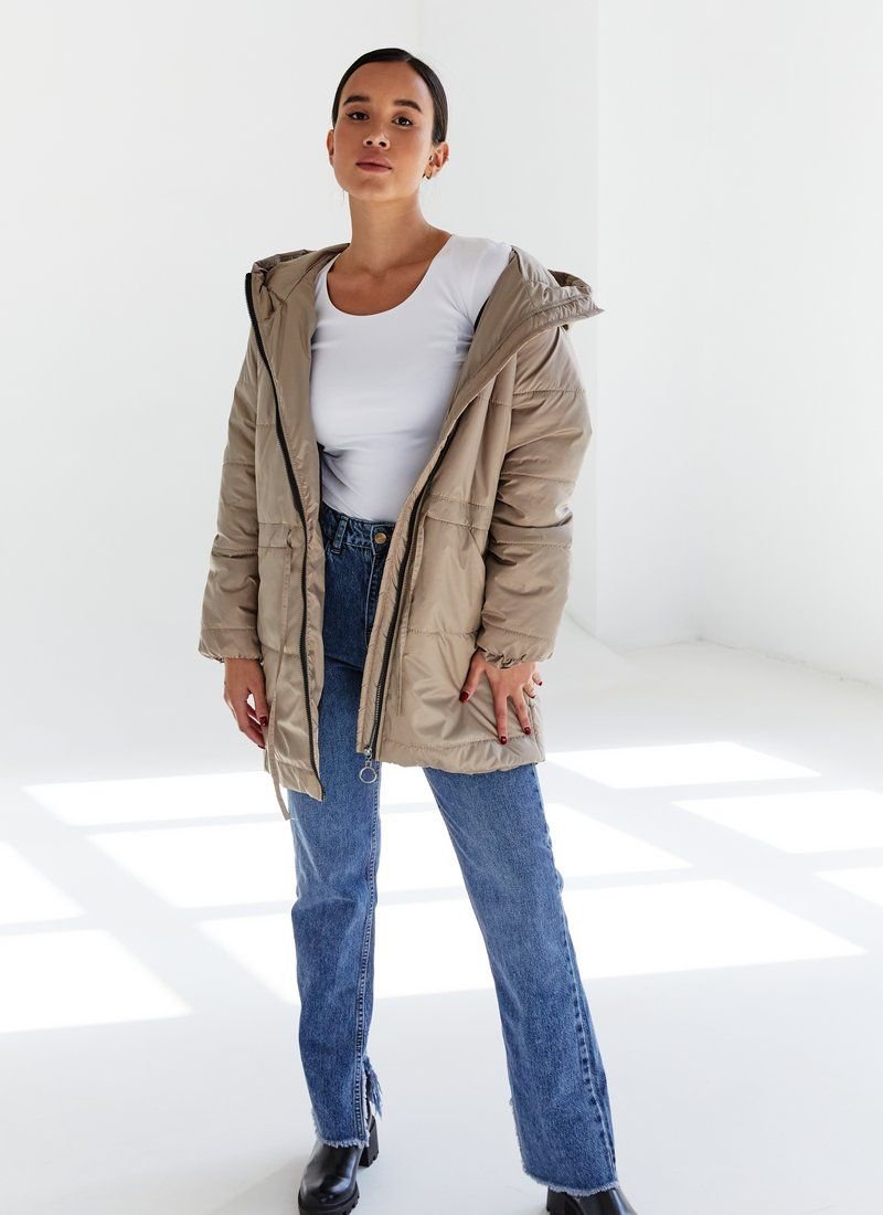 A jacket with a hood, with a tightening in the belt, which allows you to wear it as a straight one, or to focus on the waist. The model is in beige color, with a zipper, with pockets. Features: additional insulation - silicone (100 g/m2). Please note that the product is designed for temperatures up to +5 ° C.