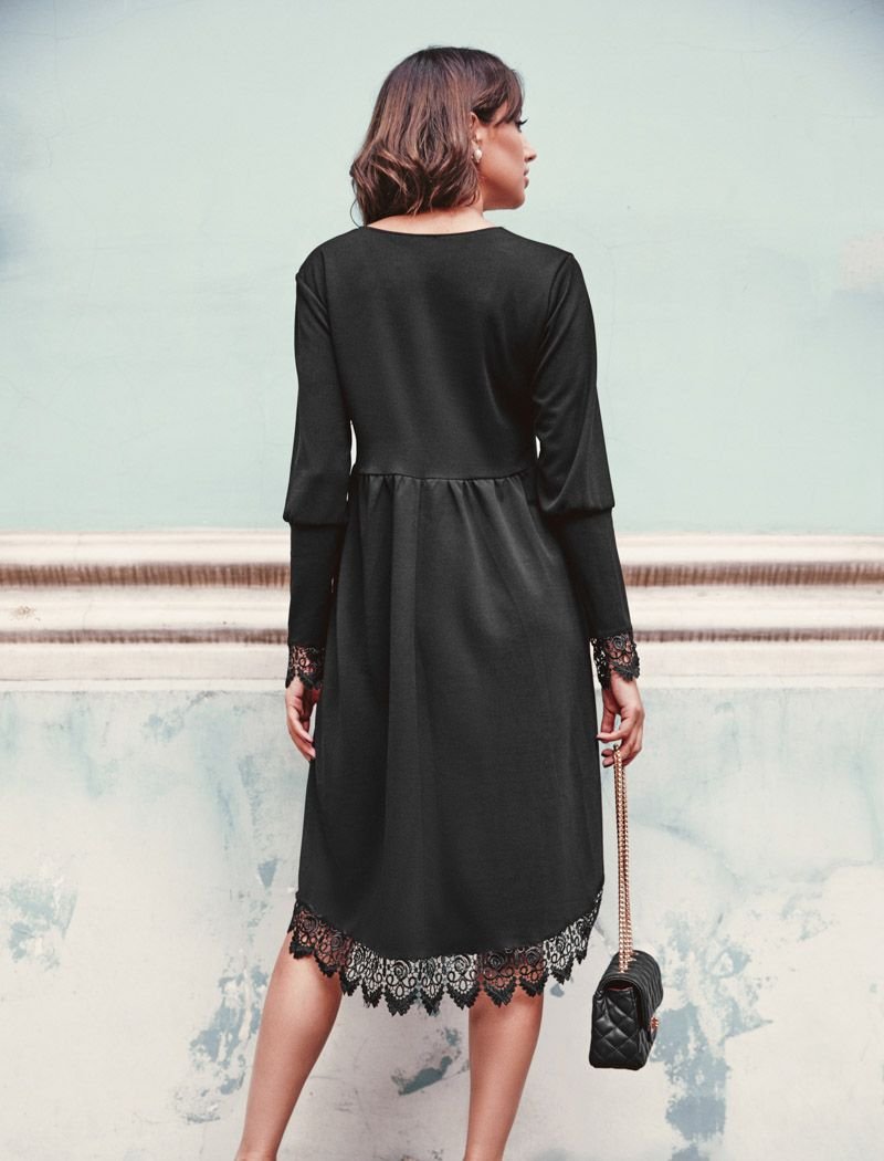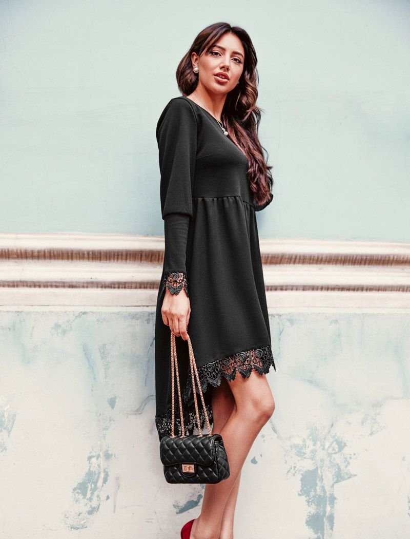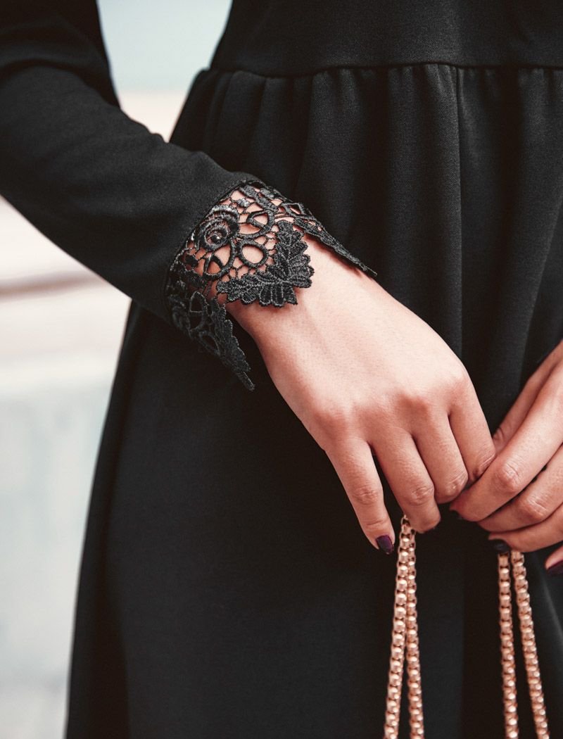 Lace black dress with a round neck, high waist, long sleeves and an asymmetric skirt with an openwork decor.