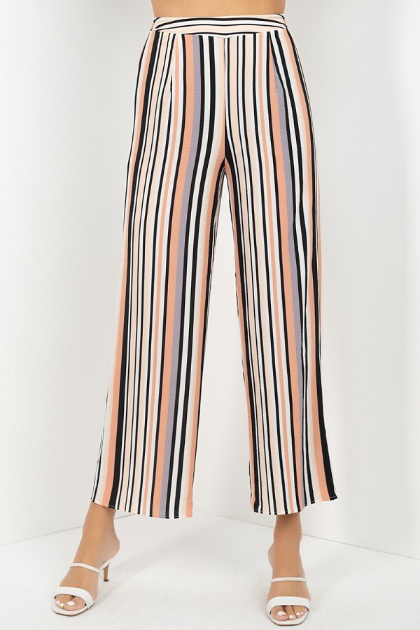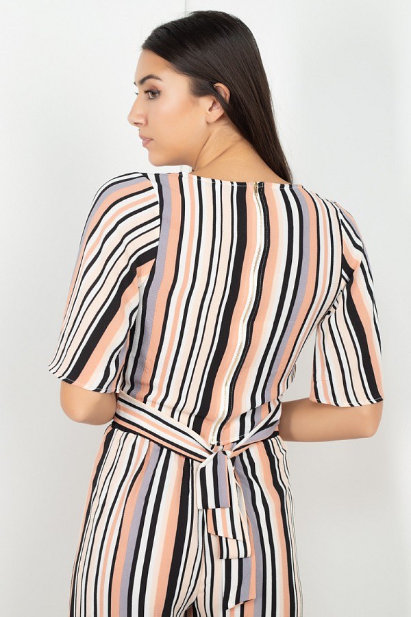 Imported S.M.L A knit top featuring all over stripes, short sleeves, a scoop neck, and a waist tie. A knit pair of pants featuring all over stripes, an elastic waist, and a wide leg fit. 97% Polyester 3% Spandex Blush IRI