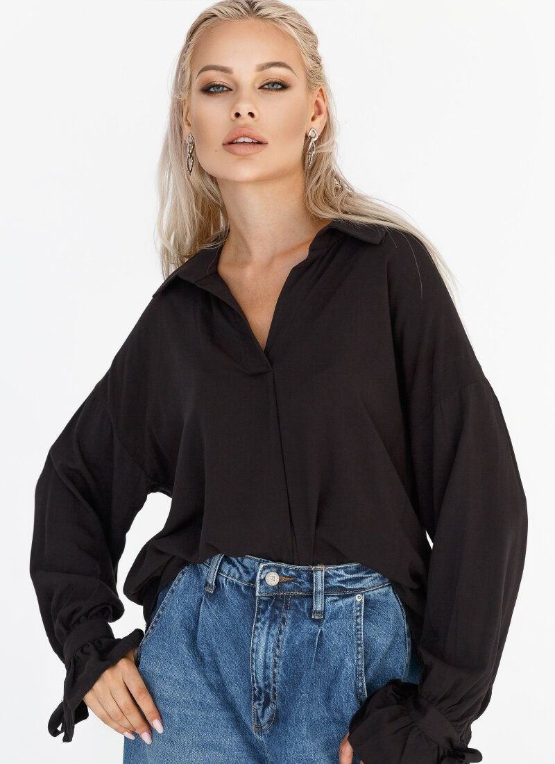 A loose-fitting shirt in basic black combined with wide jeans-slouchy creates a comfortable look for every day. Laconicity of the style is diluted by loose sleeves on the cuffs, decorated with openwork ruffles. The model is complemented by an asymmetric hem.