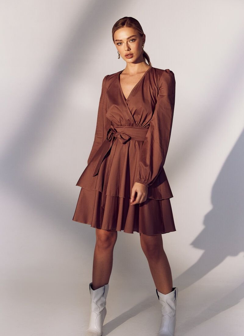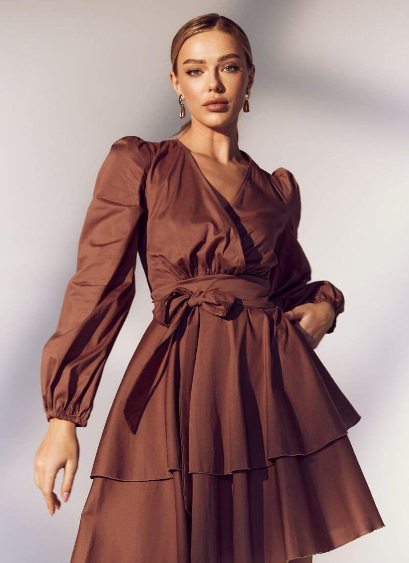 The romantic mini dress is made of blended cotton - a durable, body-pleasing material. The mood of the model is created by a multi-tiered skirt made of flounces, in the spirit of the SS’21 Balmain and Chanel shows. The bodice accentuates the decollete area, and the waist is emphasized by a removable belt-ribbon.