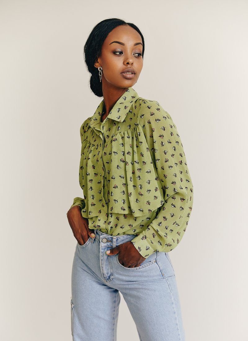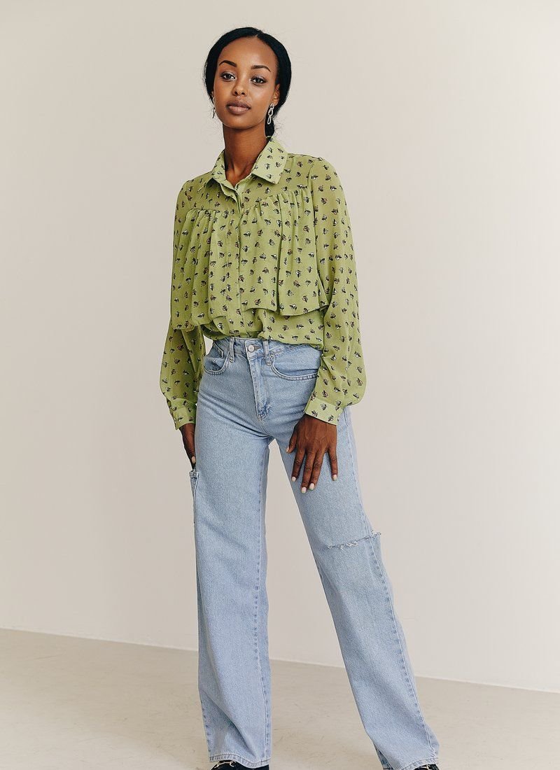 Light chiffon blouse of light green color with a turn-down collar, long sleeves with buttons. It will add brightness to your image and romantic mood due to the floral print.