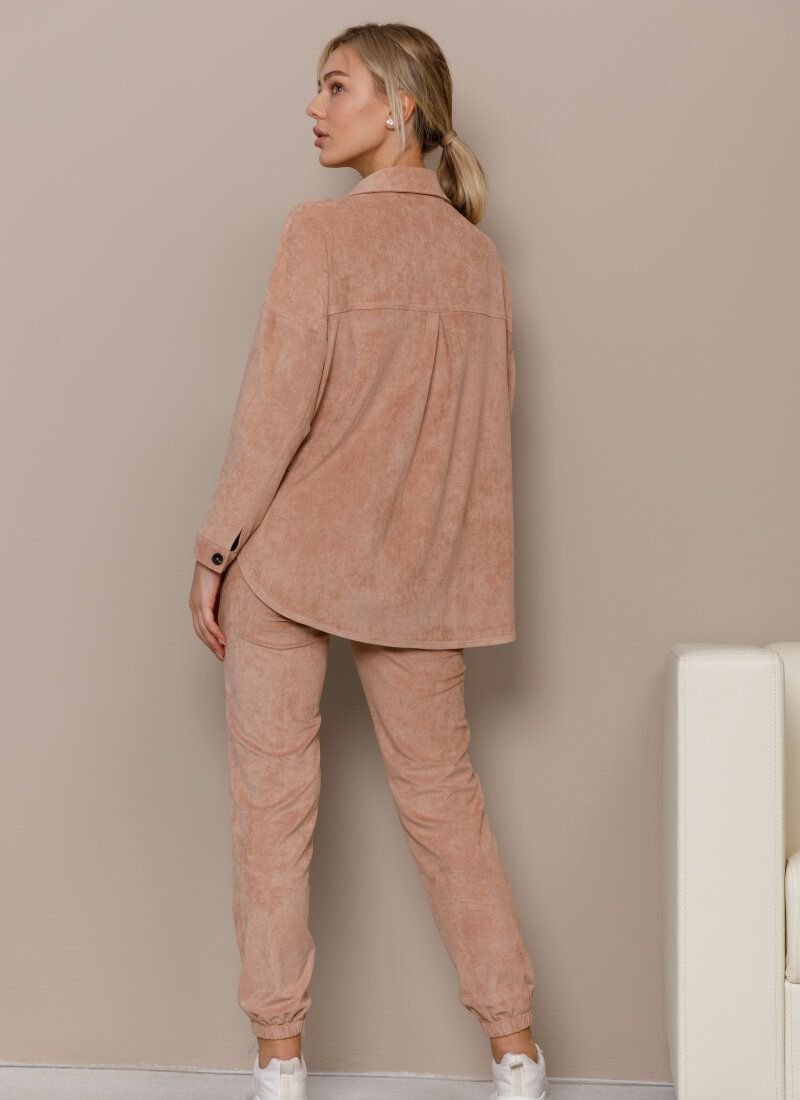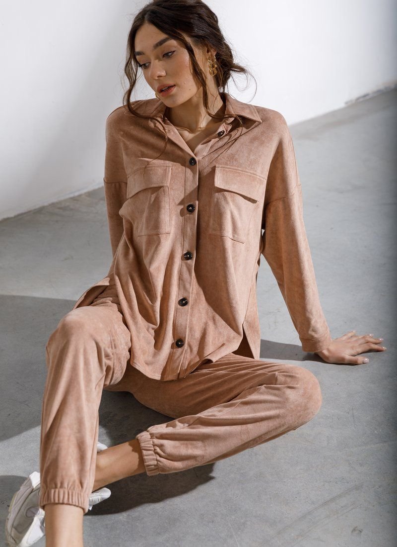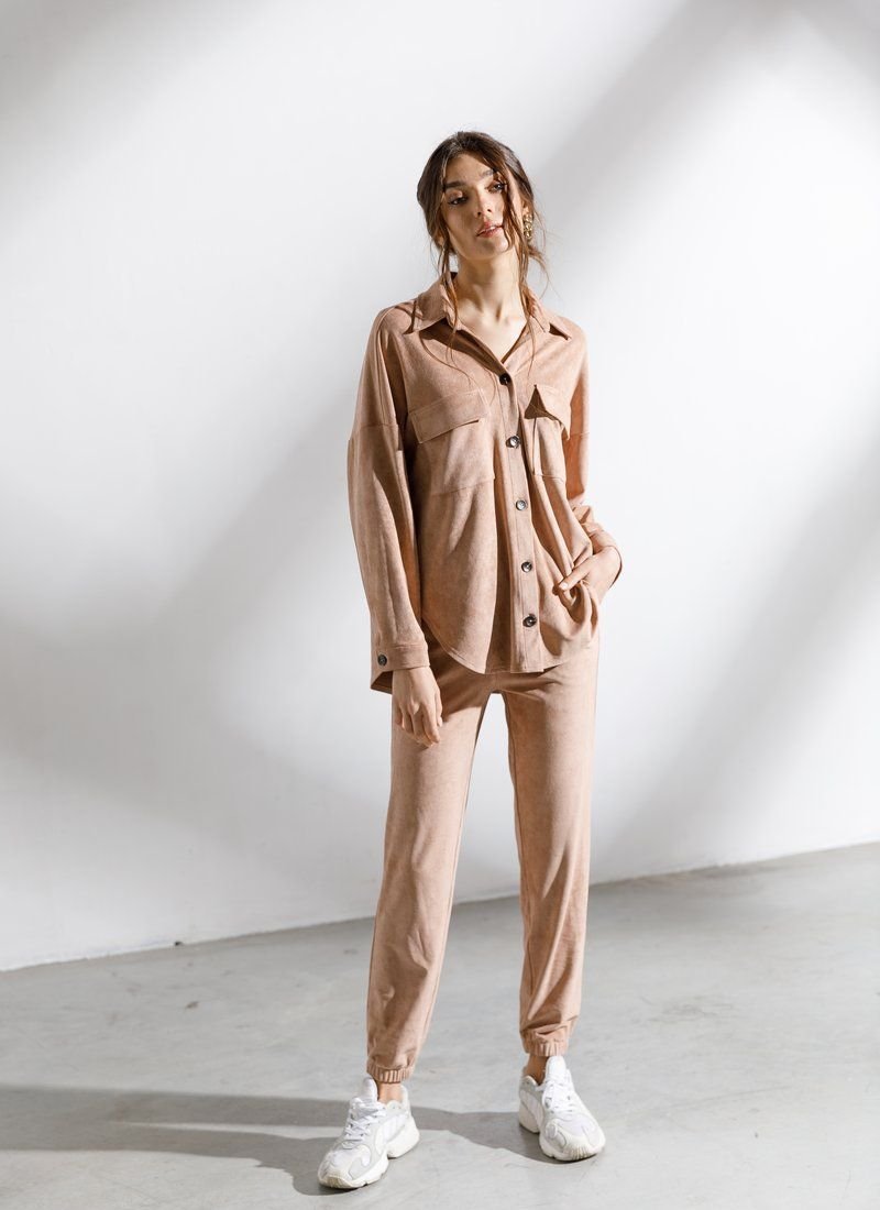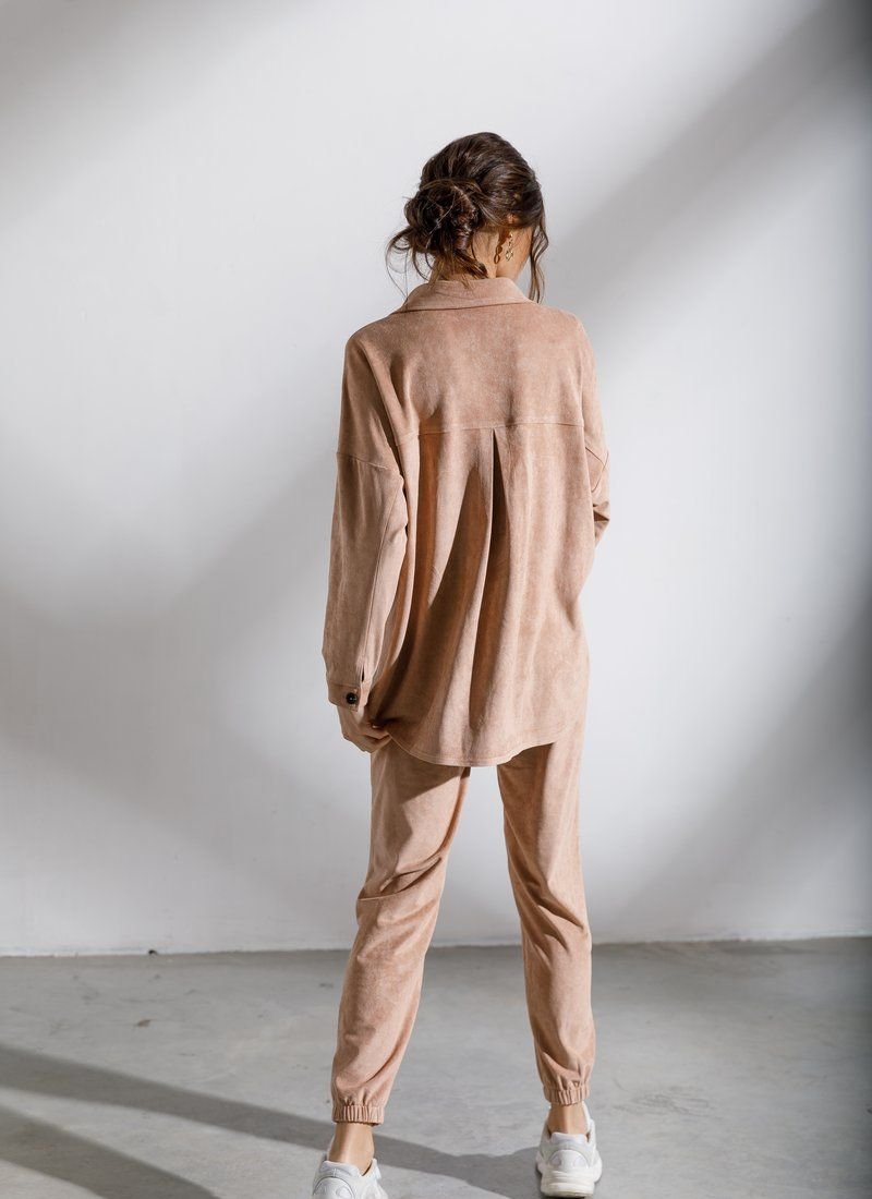 Beige suit with oversize shirt and jogger trousers is made of eco-suede, which has a soft velvet texture. For a comfortable casual look, combine the model with boots or sneakers with massive soles.