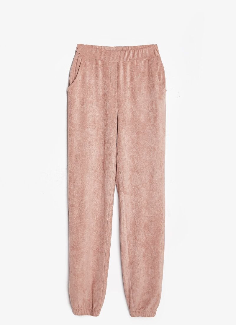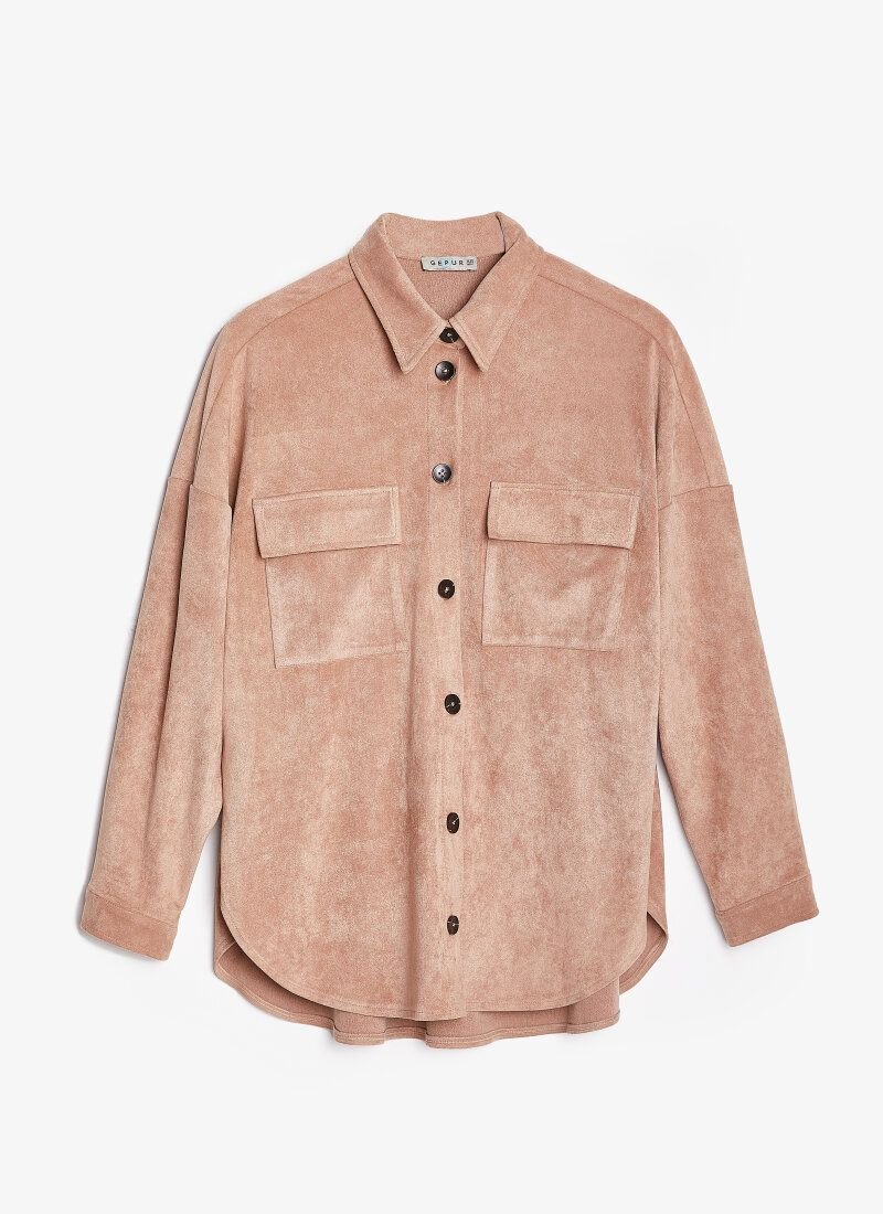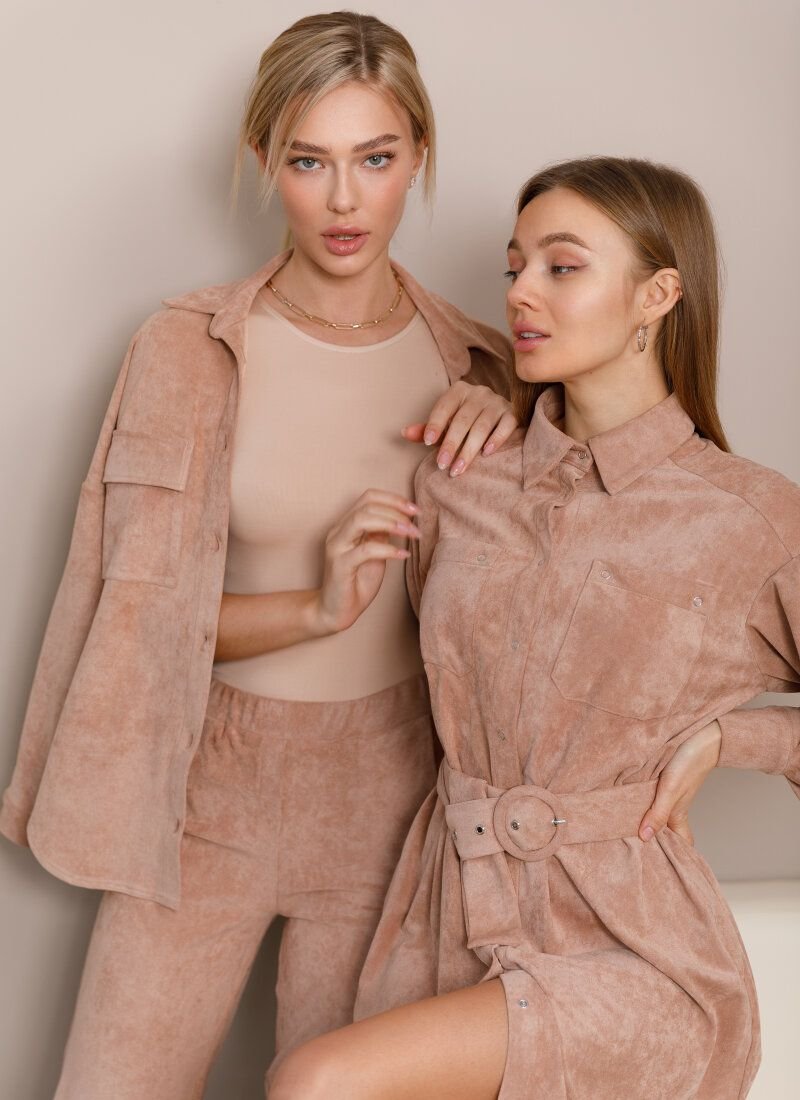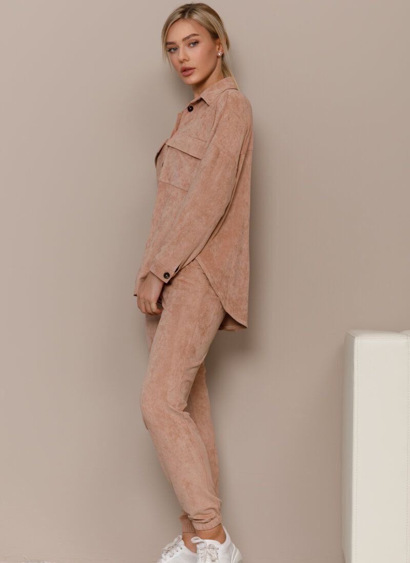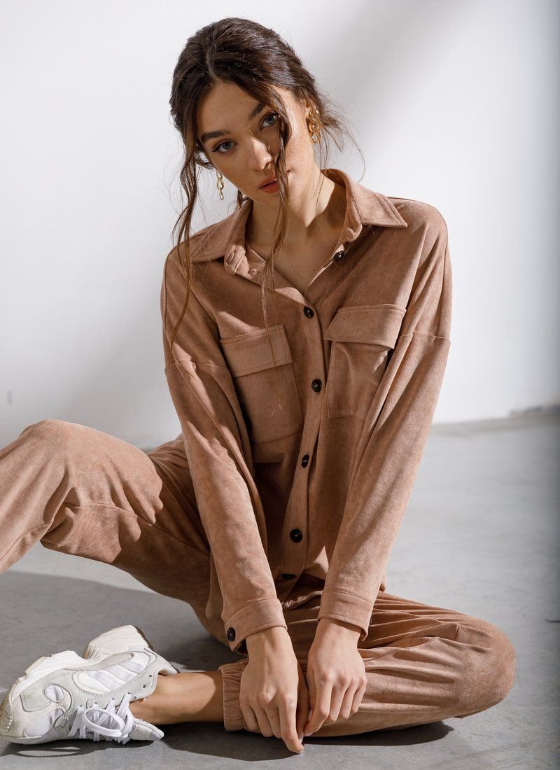 Beige suit with oversize shirt and jogger trousers is made of eco-suede, which has a soft velvet texture. For a comfortable casual look, combine the model with boots or sneakers with massive soles.