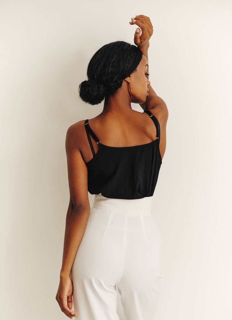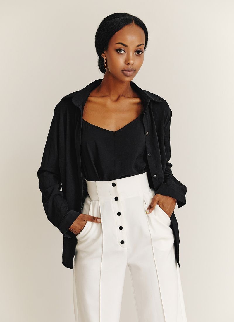 A set of a top and a black shirt. Button-down shirt with long sleeves, thin cuffs, with a turn-down collar. Straight cut top with thin adjustable straps, with an open back. Thanks to the versatility of things, they can be worn both together and separately, which will help create a lot of images.