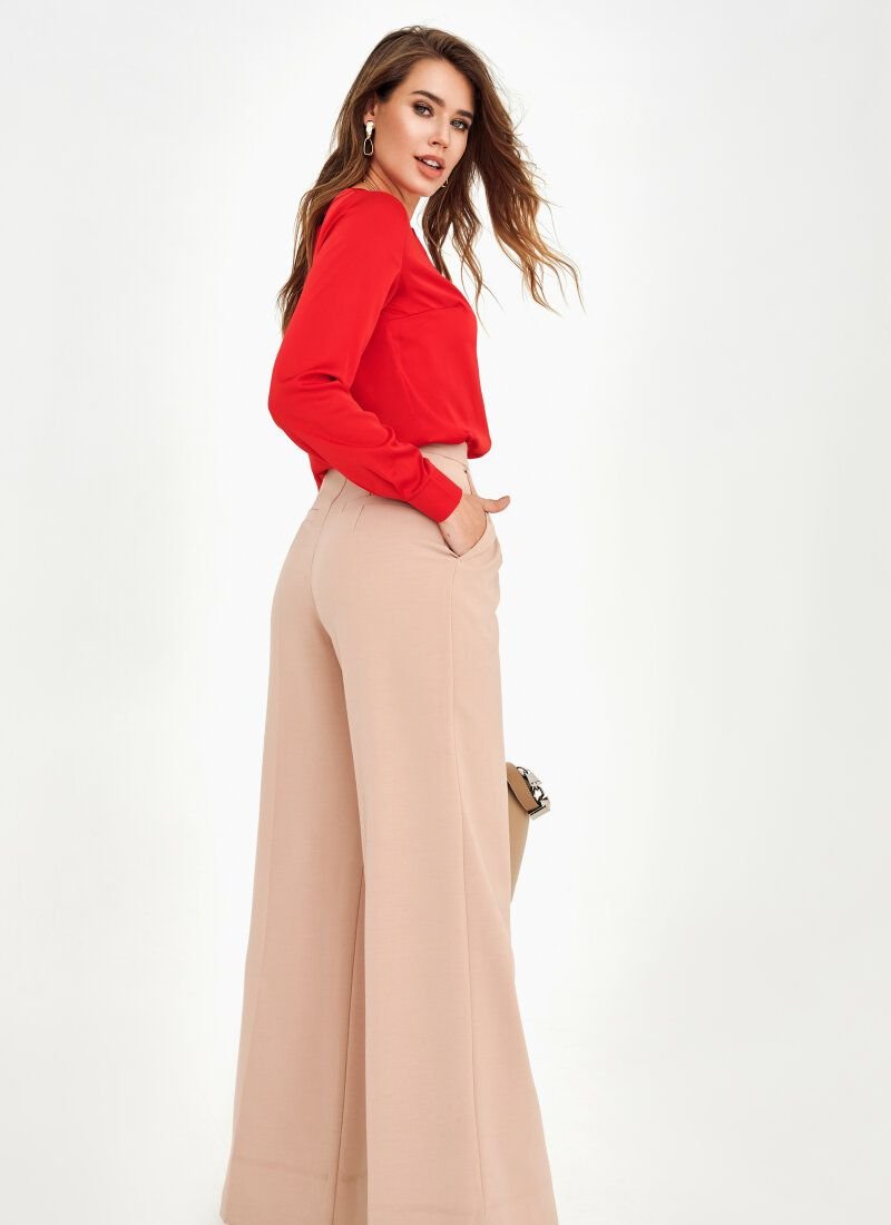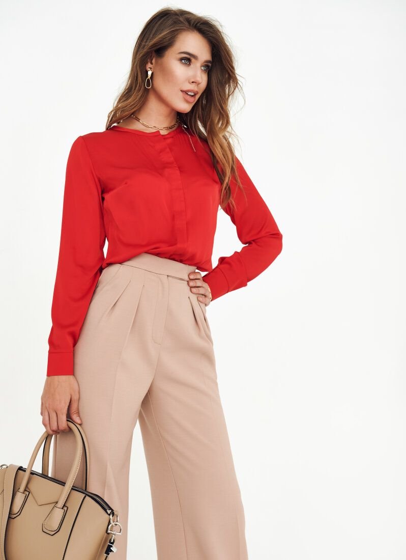 A strict red silk blouse with a round neck, long sleeves and a hidden button placket in front.