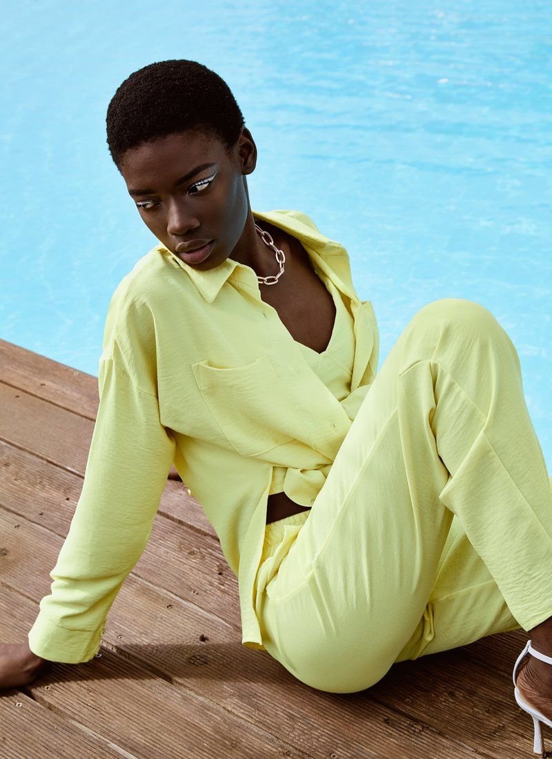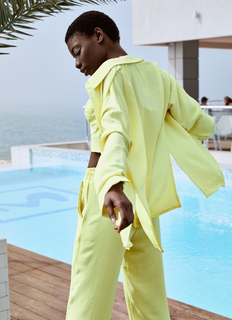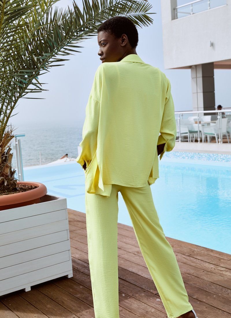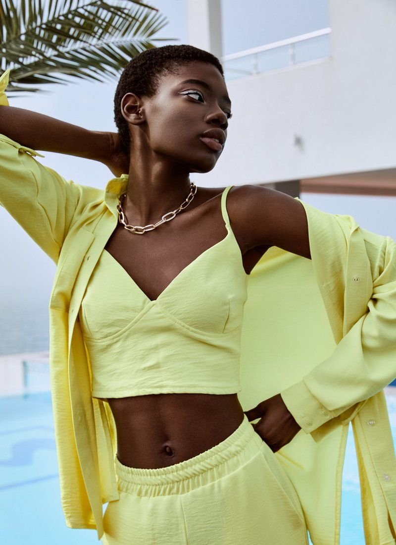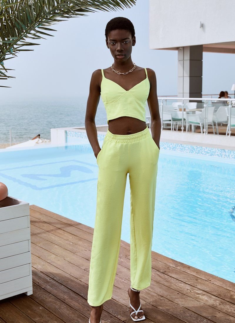 The yellow suit will easily become the basis of a comfortable everyday bow. The model consists of a crop top with thin non-adjustable straps, straight trousers and a loose shirt. Elastic inserts on the belt and on the back allow the products to sit comfortably on the figure.