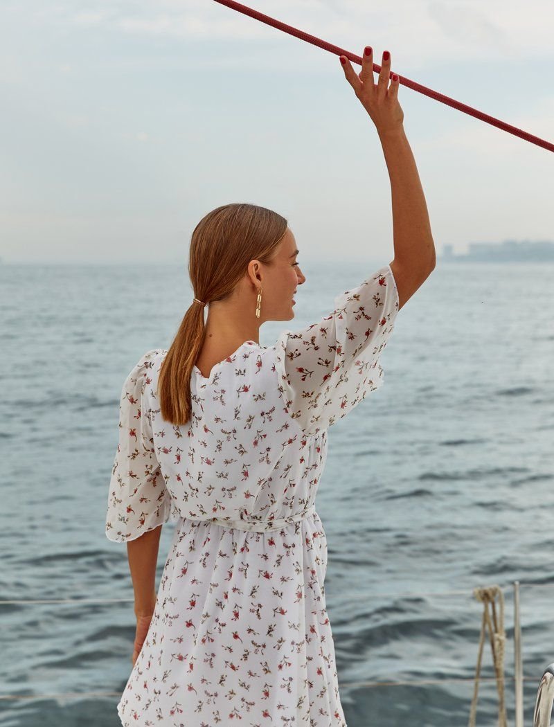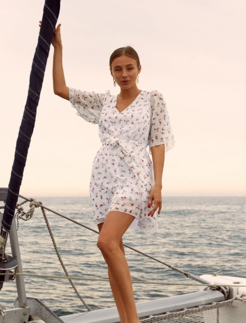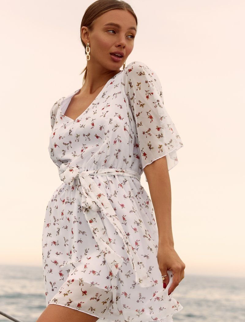 An airy white dress with a floral print, made of light chiffon fabric. A neat v-neck on the chest, a short flared sleeve, an elastic insert at the waist and a short skirt. This model has a removable belt-belt.