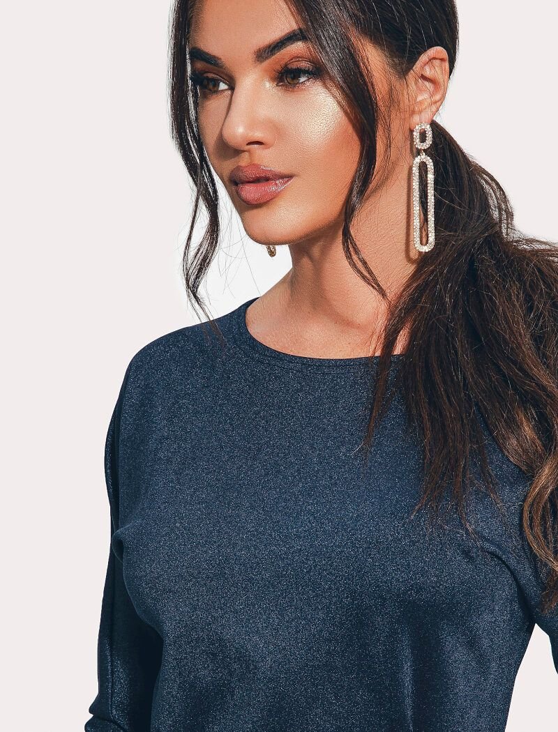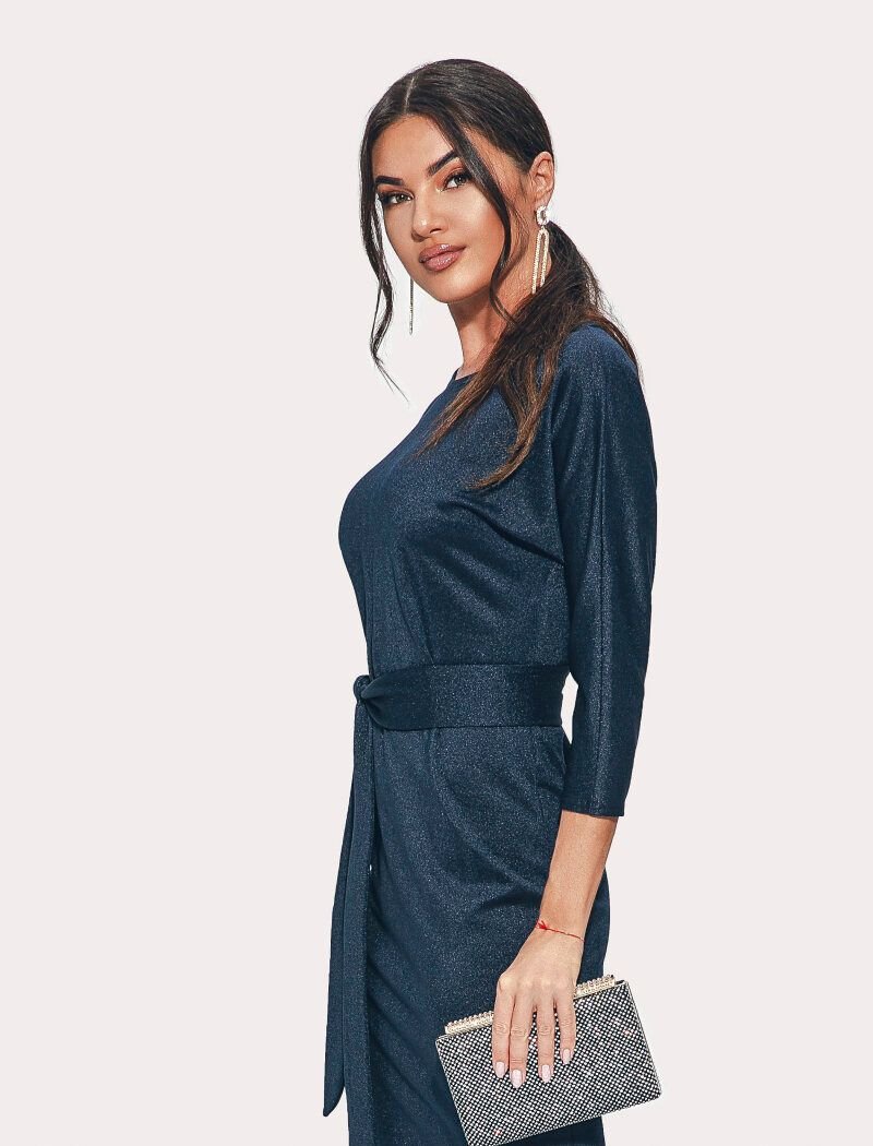 Short evening dress with lurex thread: fitted cut, cozy knitwear, round neck, one-piece raglan sleeve, tight skirt, complemented by a removable belt.