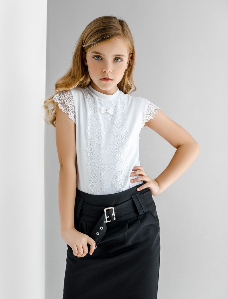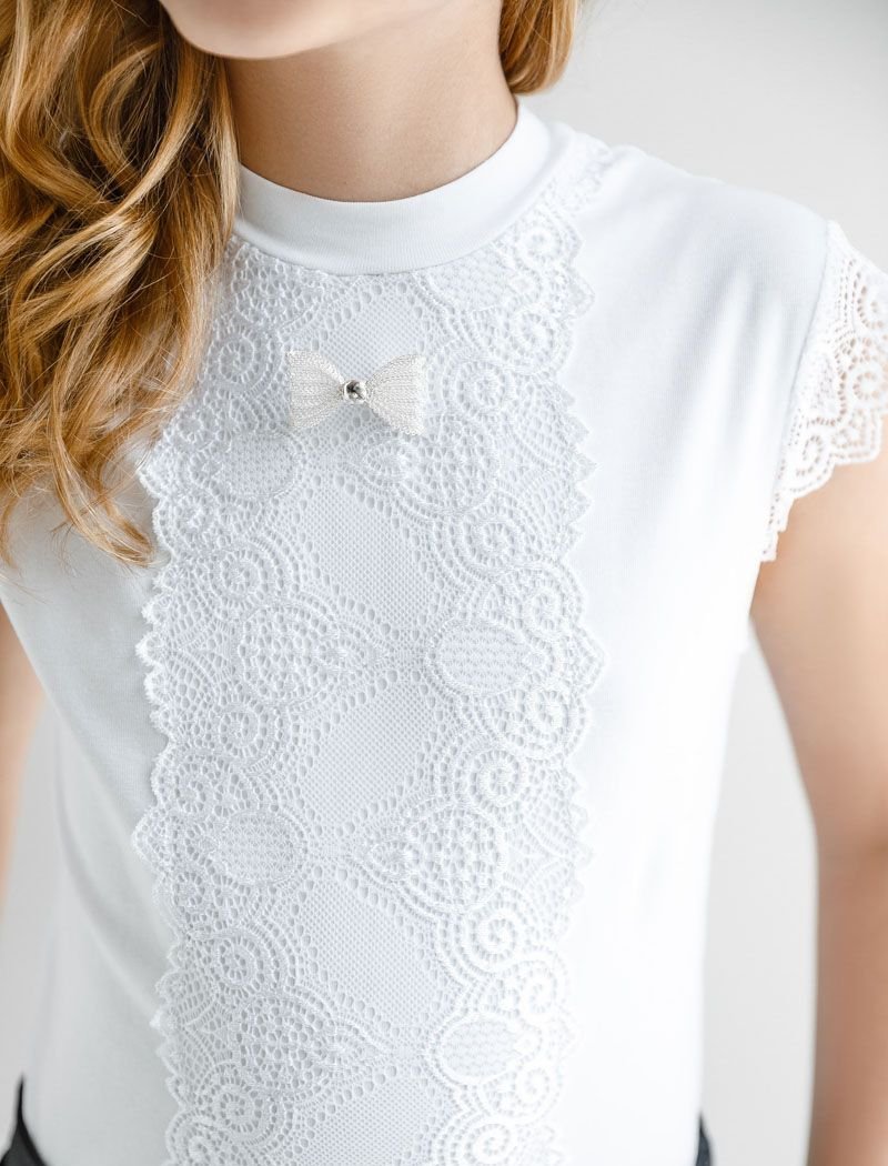 Cotton blouse with lace, round neck, wing sleeves and removable brooch.