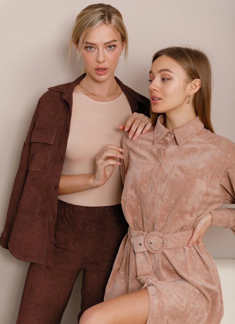 A chocolate-colored suit with an oversize shirt and jogger trousers is made of eco-suede, which has a soft velvet texture. For a comfortable casual look, combine the model with boots or sneakers with massive soles.