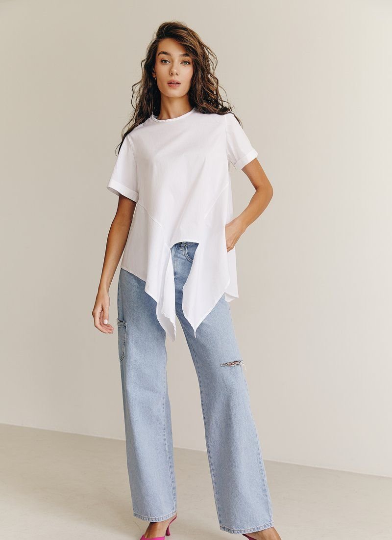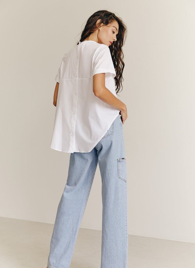 White shirt with short sleeves, elongated edges in front, which allows you to make a bow, or wear it freely. Button-down shirt at the back.