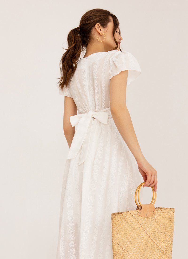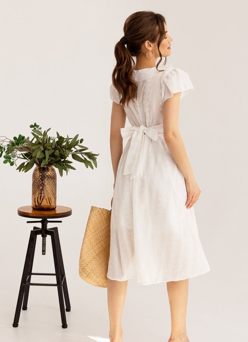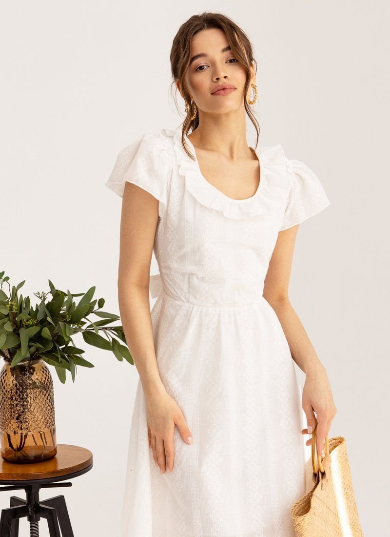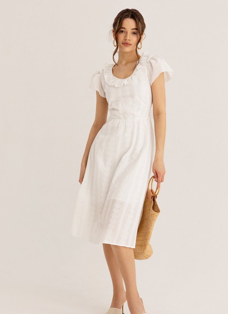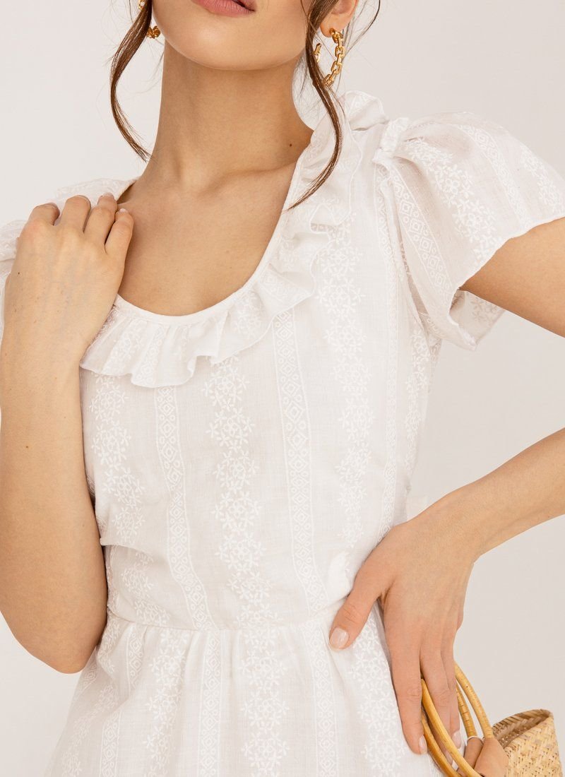 The white dress was made of light fabric decorated with minimalistic floral embroidery. The fitted cut was supplemented with a sewn-on belt, and the round neckline with a frill. All this played on the romance of the model, and sandals and a miniature bag will help to support her mood.