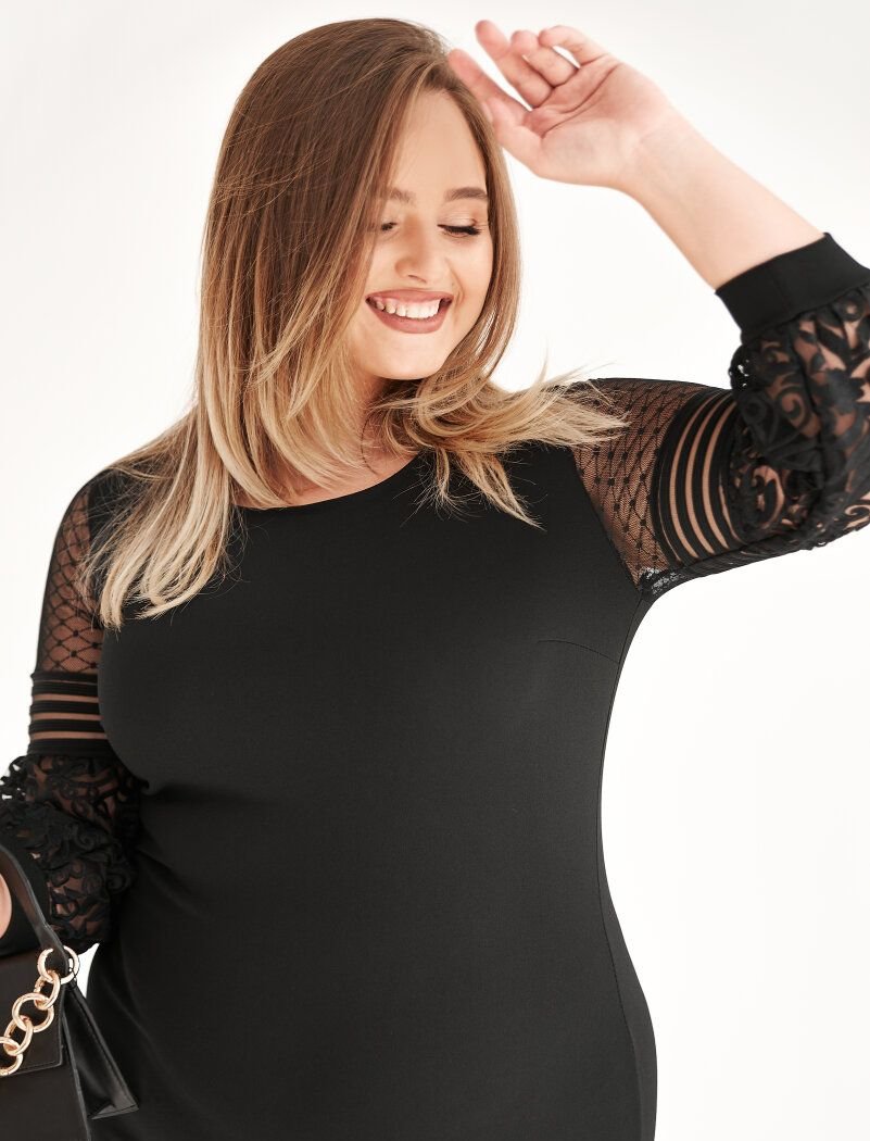 Despite the laconic cut, a fitted short dress does not look simple. It's all about the openwork lace sleeves with elastic cuffs. The mini length and round neck complete the look.
