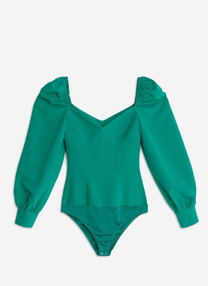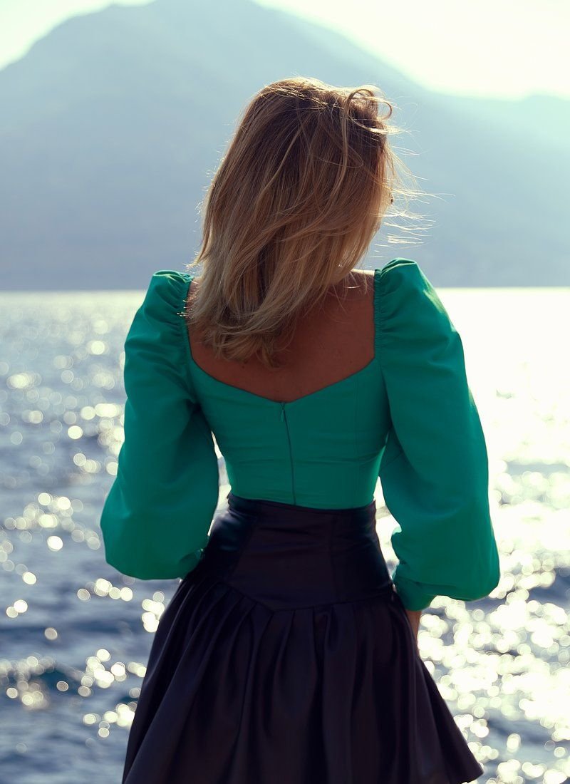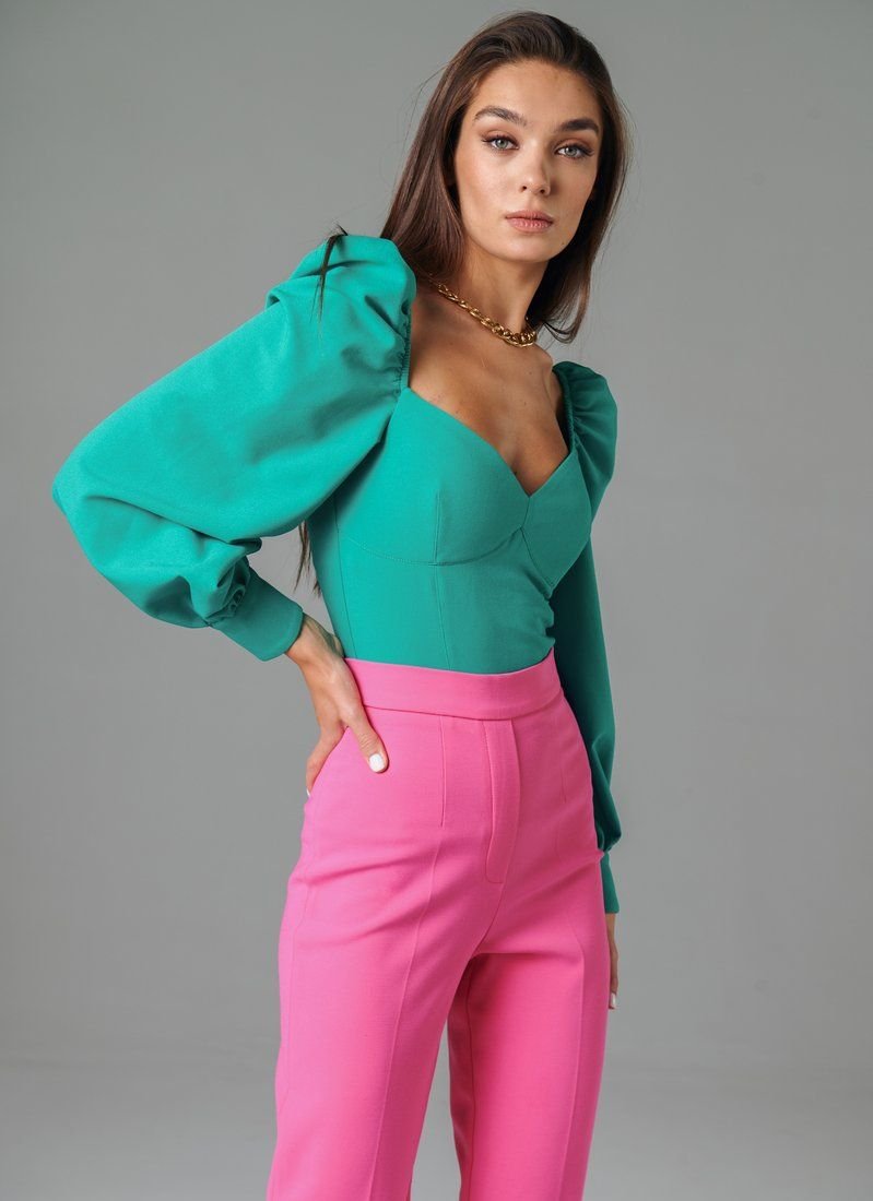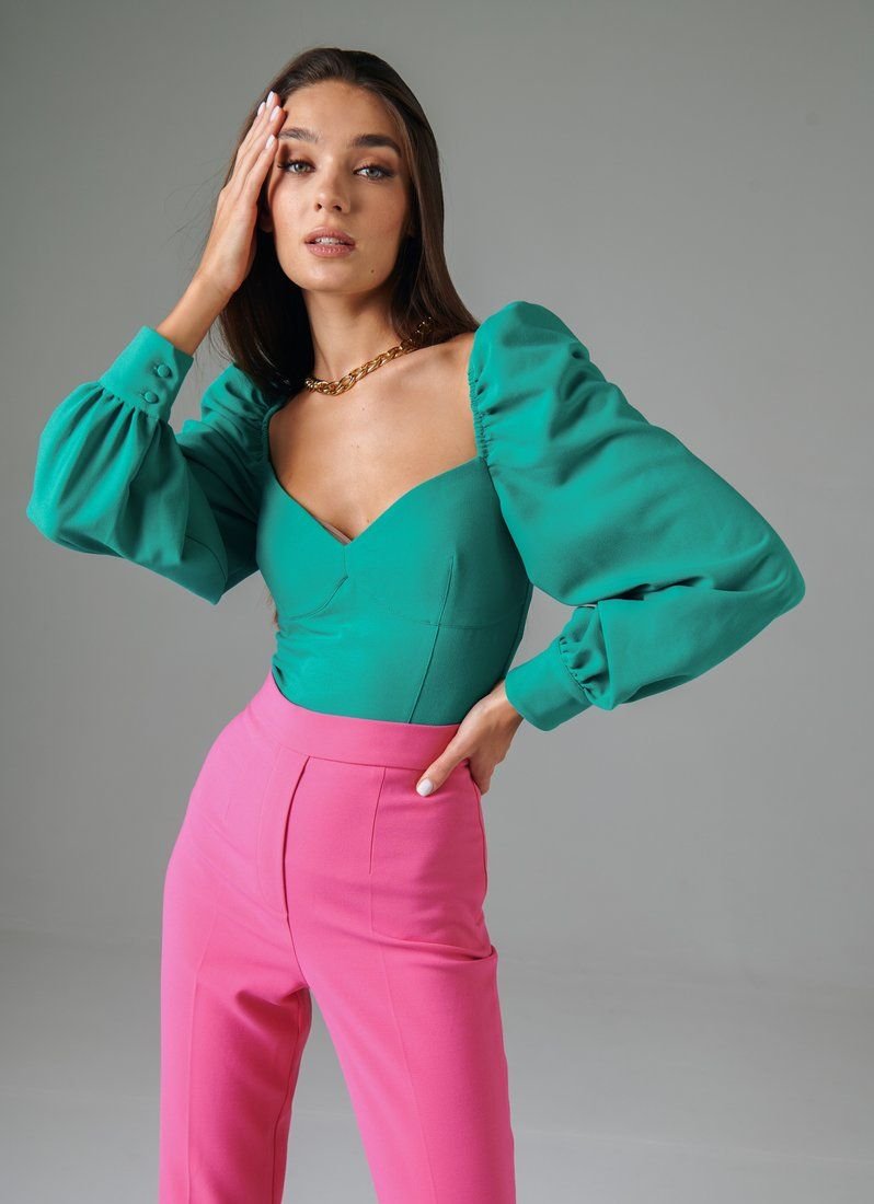 Turquoise bodysuit made of costume fabric supports several SS?21 trends at once: voluminous sleeves, a curly neckline and a cropped cut. The model is perfect for a special occasion - a date, a party or going out. The product is complemented by a zipper at the back.
