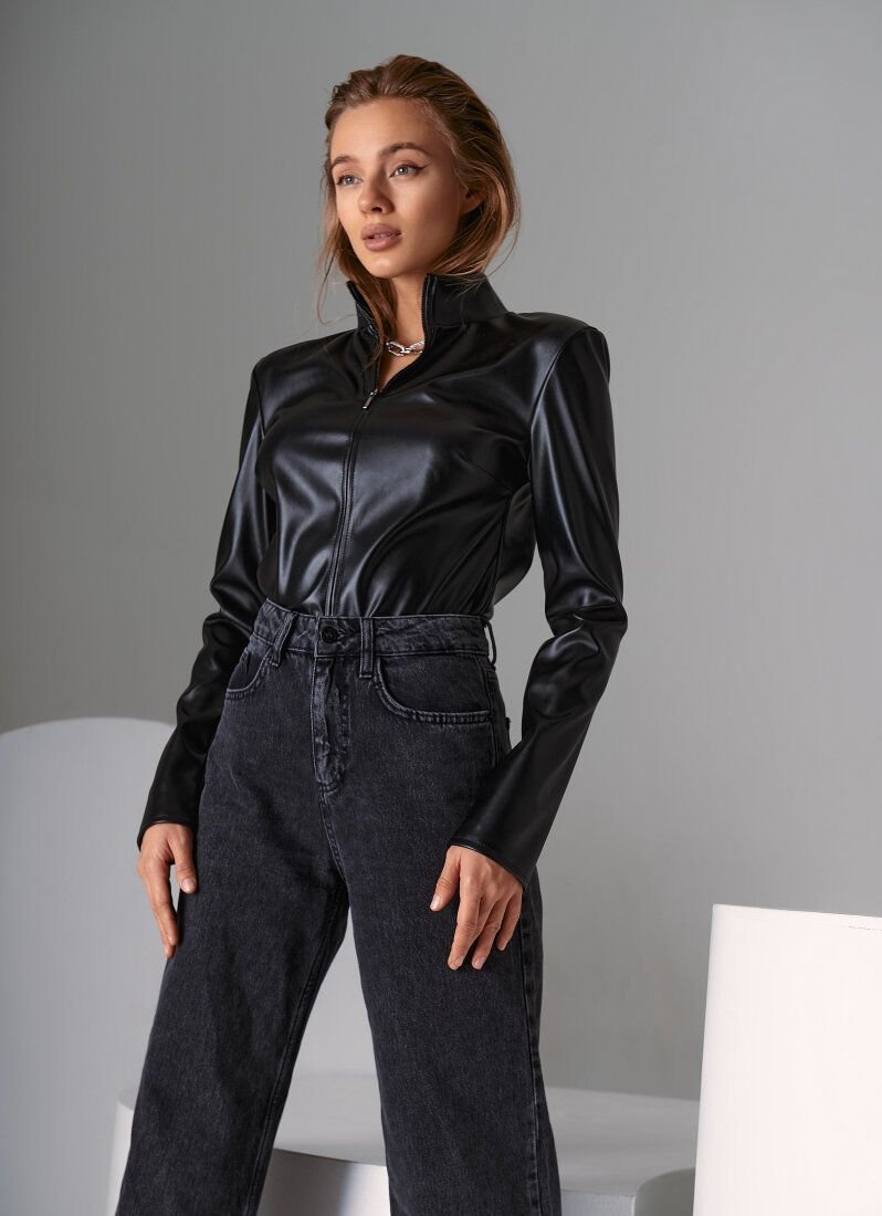 Pure black color and laconic cut do not prevent the jumper from looking expressive. The originality of the style was given with the help of delicate eco-leather on a soft cotton base. The zipper from the collar to the chest line allows you to experiment with the image.