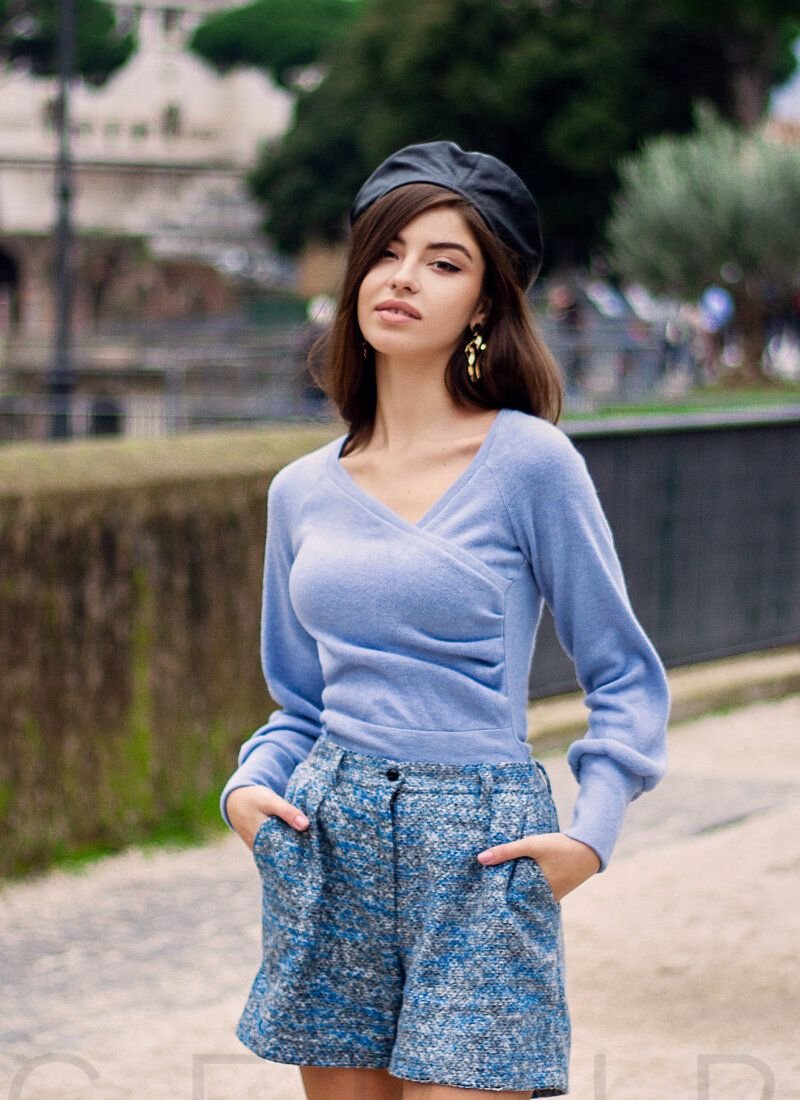 Cozy knitted pullover of sky-blue color: a tight fit, a fixed smell, a neat v-neck, a long sleeve with an elastic cuff, a wide bottom edge.