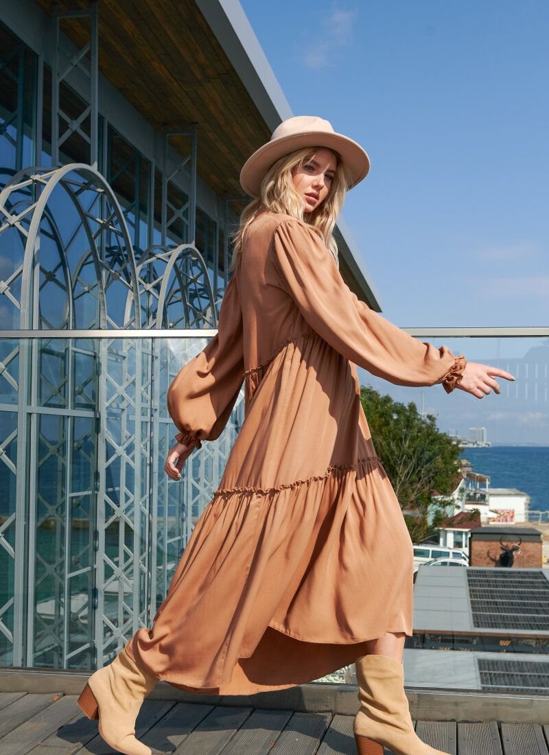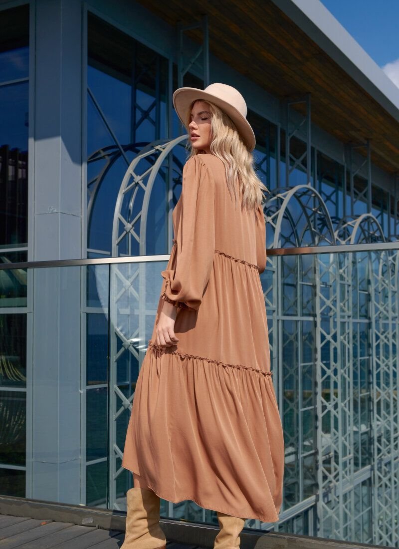 Despite the loose cut, the beige dress is not devoid of femininity. A multi-tiered skirt and voluminous sleeves with an elastic cuff work for this. The model is complemented by a round neckline that balances the style.