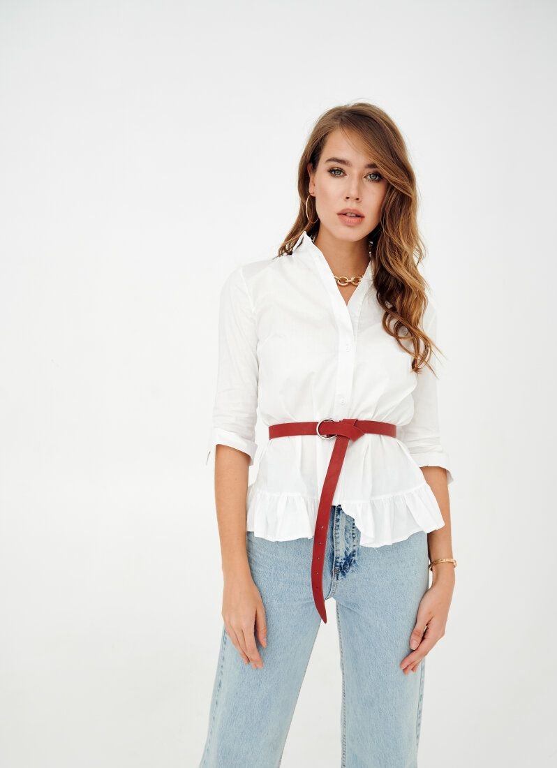 A white shirt will dilute the classic office dress code and allow you to get rid of excessive rigor in the image. A dense cotton-based material was chosen for sewing the model. The lower edge of the product was supplemented with a frill.
