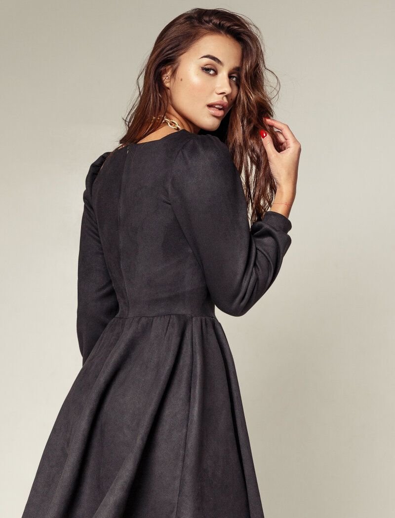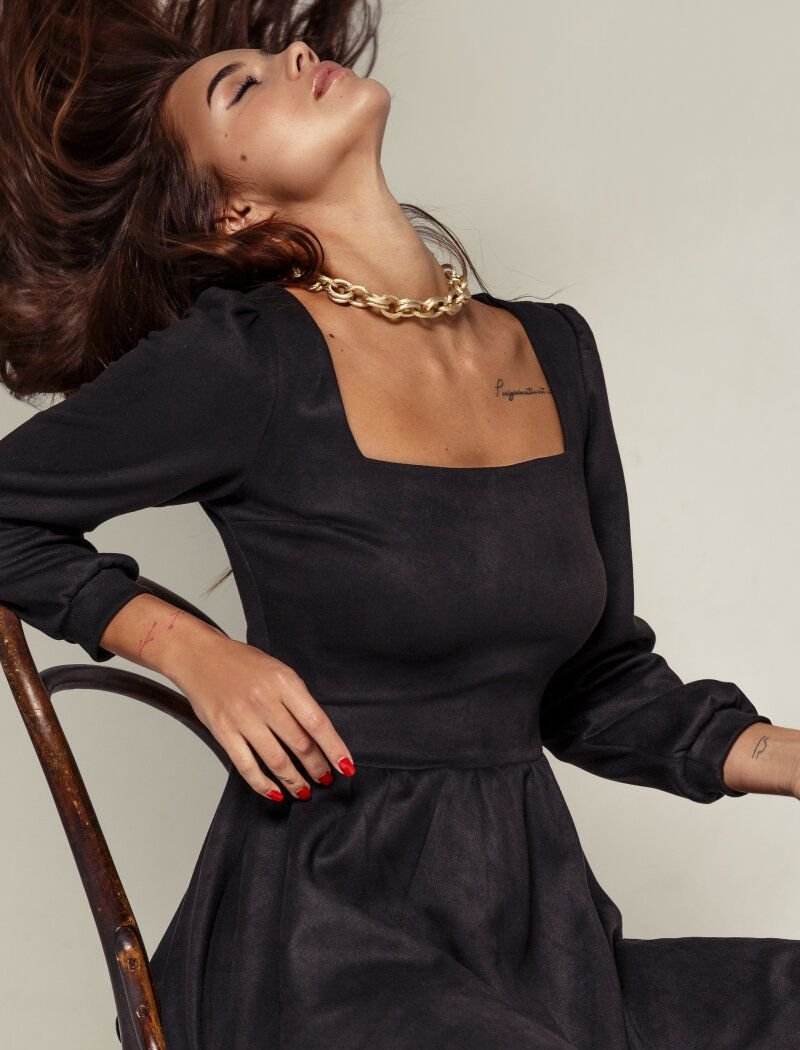 The black mini dress combines two trends at once: a soft suede texture and voluminous sleeves in the spirit of FW 2020/21. A fitted cut with a flared skirt forms a feminine silhouette. The cleavage area is emphasized by the square neckline.