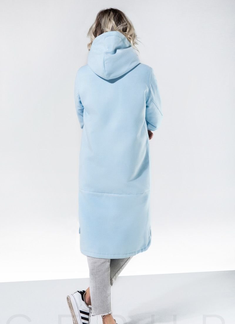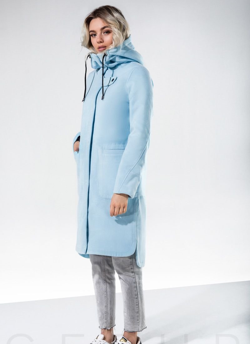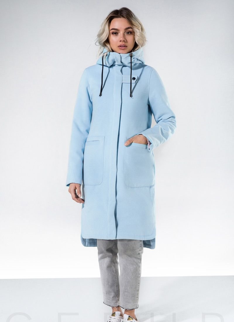 Demi-season women's sports coat: comfortable hood with drawstring ties, two large patch pockets, rounded hem and small slits on the sides.