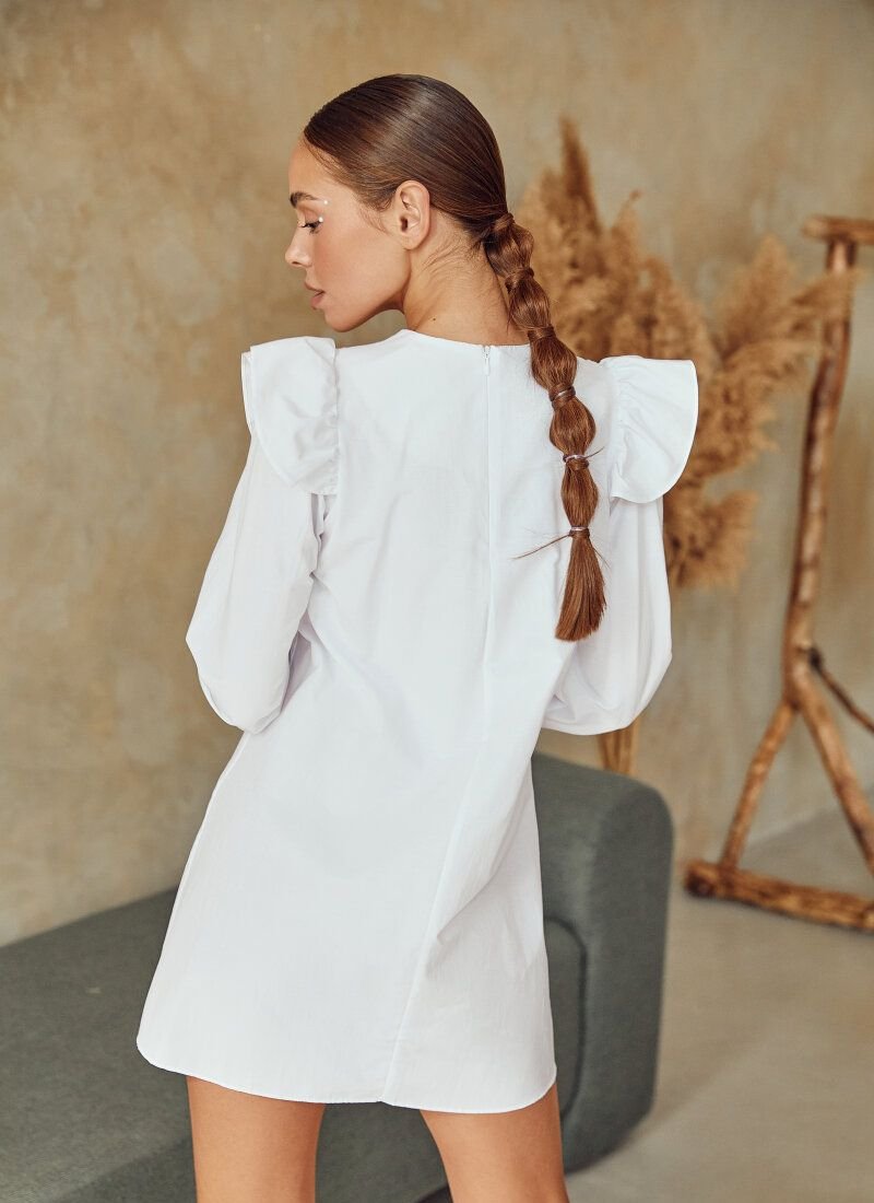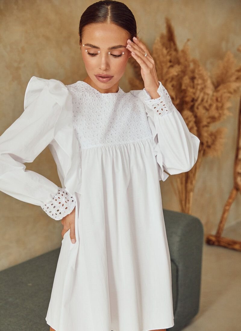 A short loose dress looks almost weightless. The right mood was set with a combination of light cotton fabric and decorative inserts with embroidery. The product also benefited from the snow-white color and vertical shuttlecocks: together they give the thing a romance.