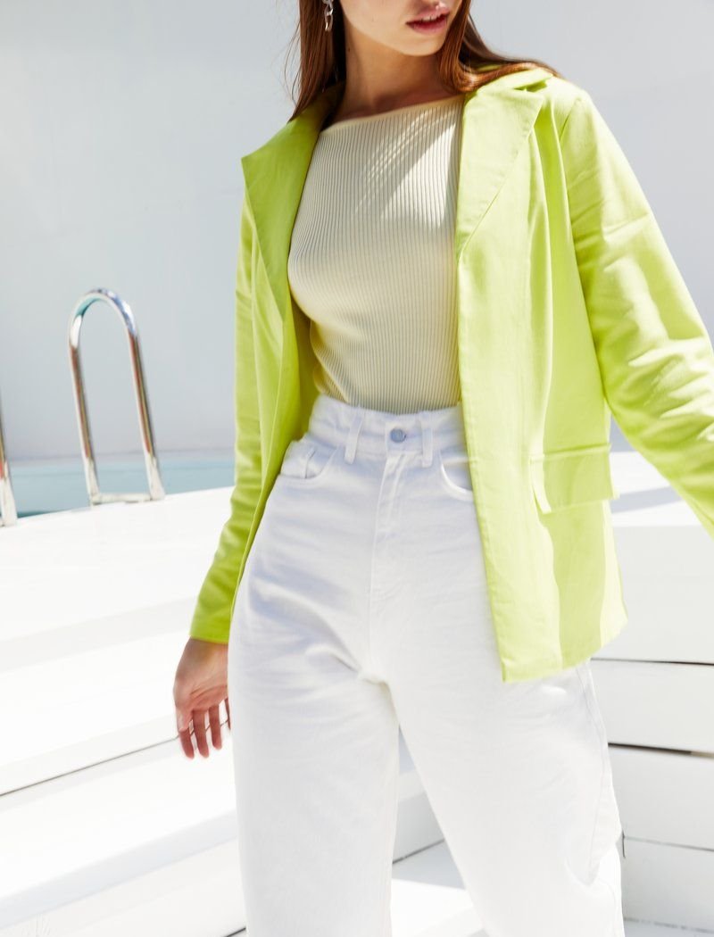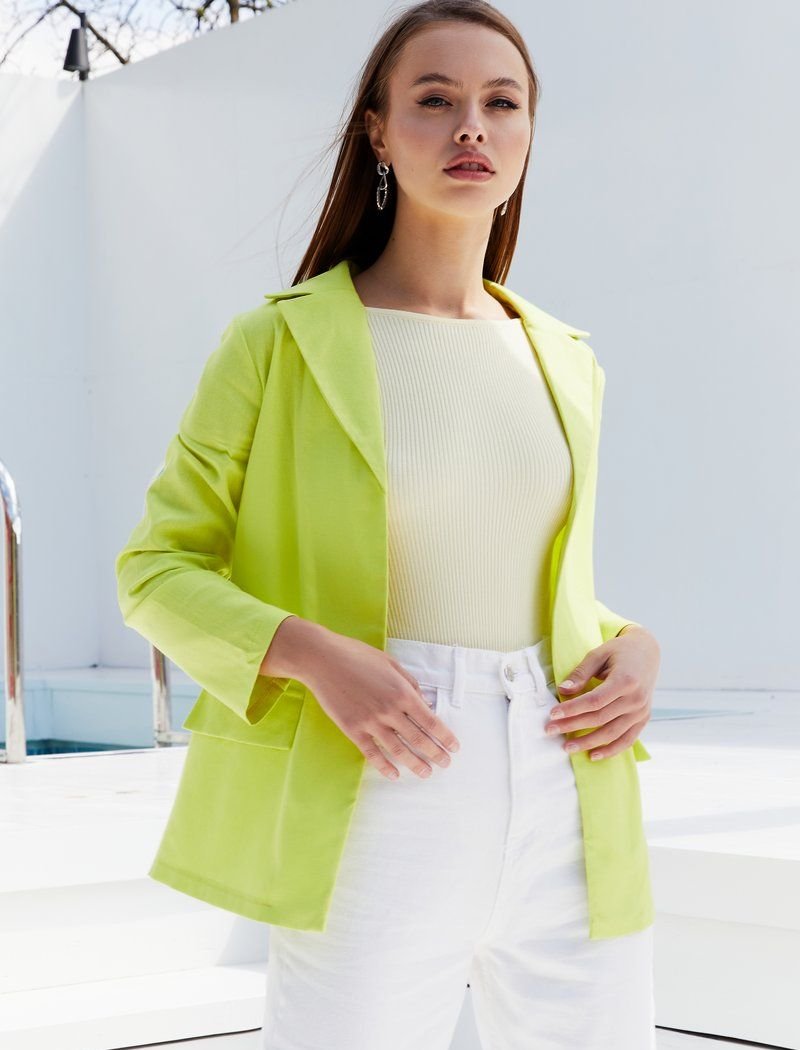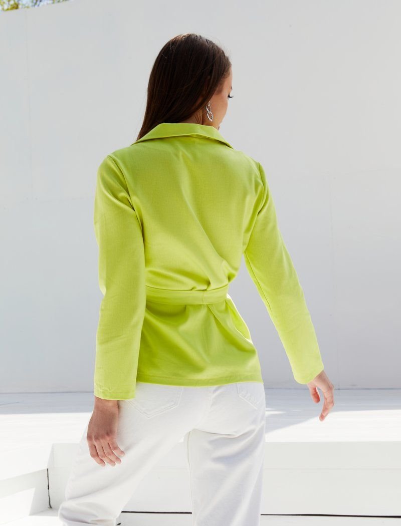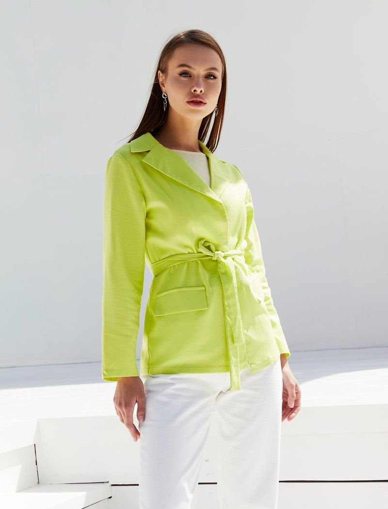 A jacket made of light fabric allows you to add an element of classics to your summer wardrobe. The light #008000 model is made of mixed flax|which does not float. The absence of a clasp and a belt-ribbon add relaxation to the image.