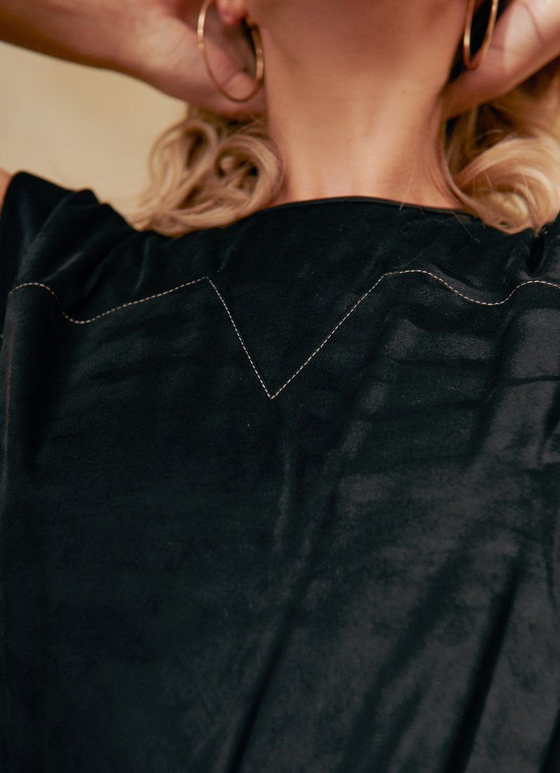 A black suit with a skirt and top from Gepur is made of suede. This is a pleasant material to the body, which is characterized by a soft texture. The form-fitting cut of the bottom was compensated by a more voluminous top with foam shoulders. Contrasting stitching on the products acts as a decor.