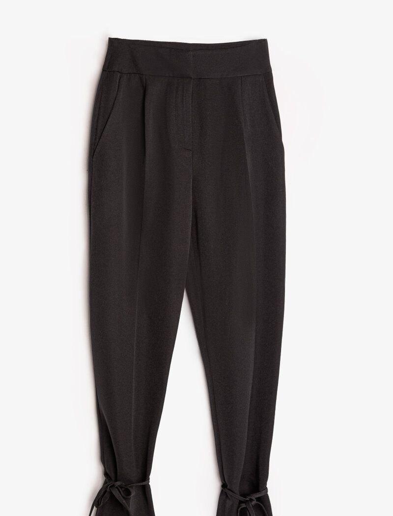 Black cropped trousers are sewn from a smooth suit fabric, which synthetic fibers give strength and a light shine. The product with a high fit at the waist and pinches was supplemented with arrows that visually build a vertical and give the image a graphic look. The lower edge of the trousers is decorated with decorative bows on the side.