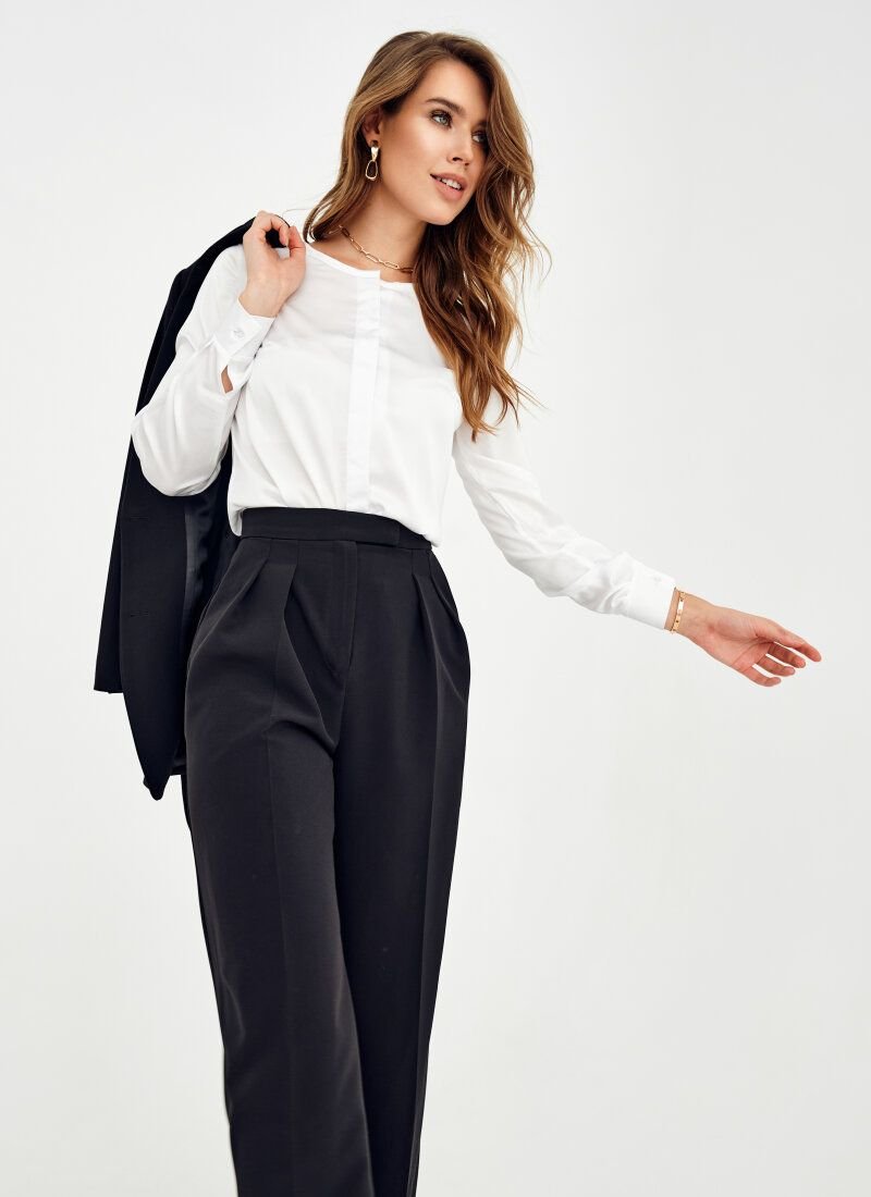 A strict silk blouse, white with a round neck, long sleeves and a hidden placket with buttons in front.