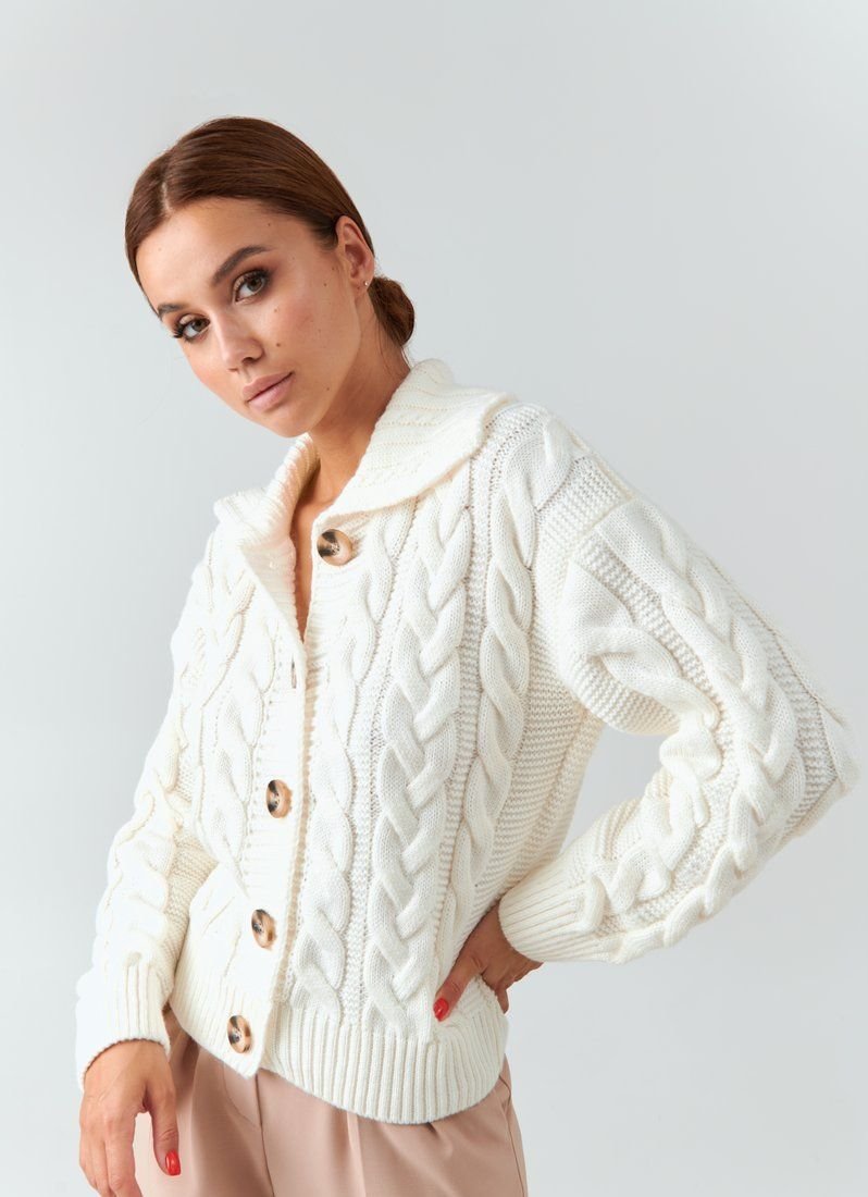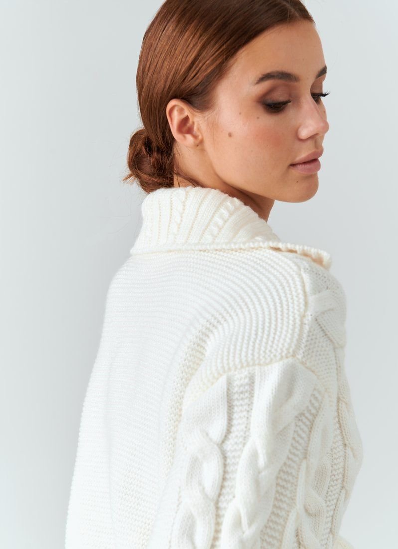 White wool jumper with buttons. The jumper is decorated with a knitted pigtail, as well as a large collar. This model can be worn as an independent thing, or over tops or shirts.