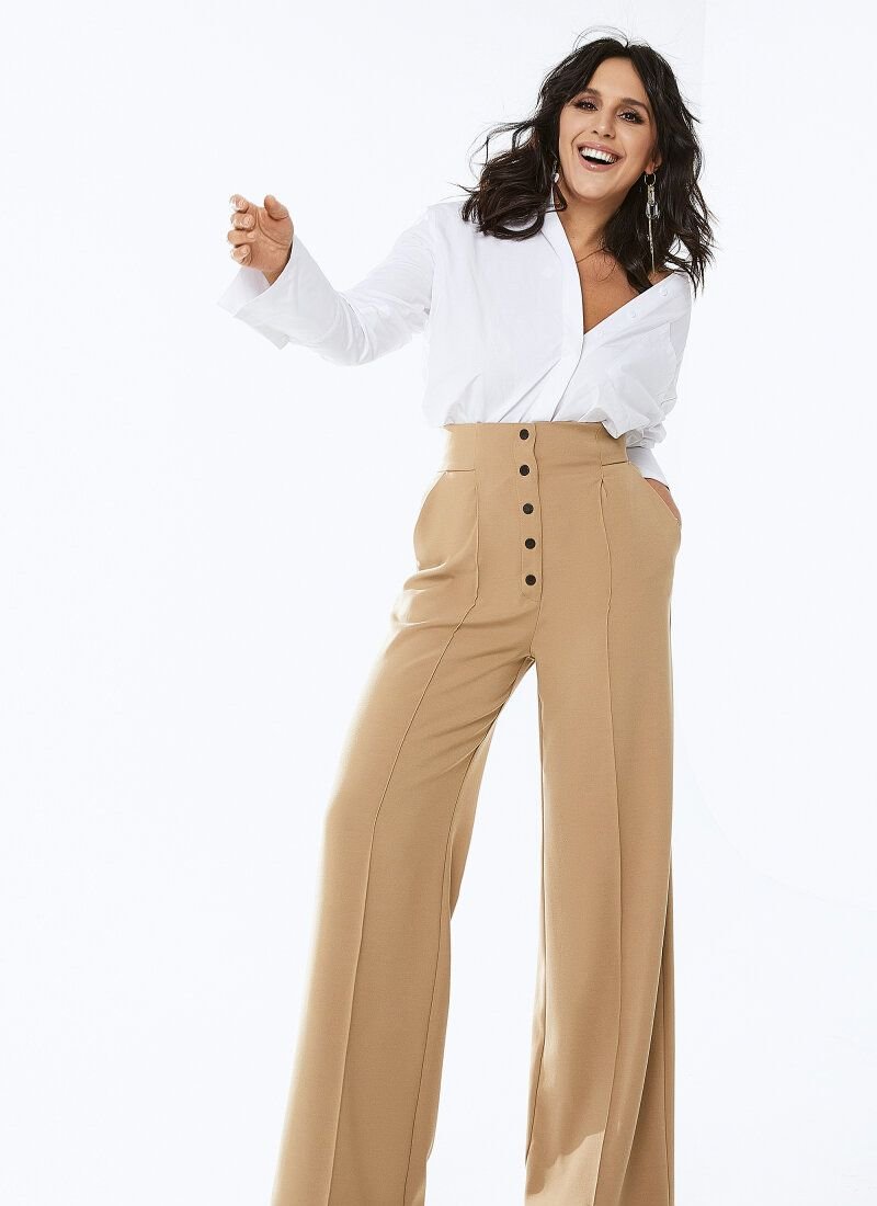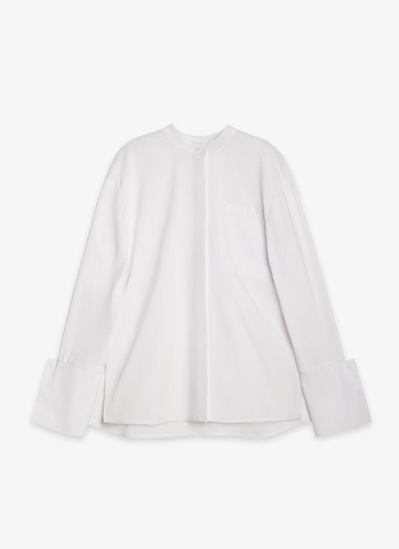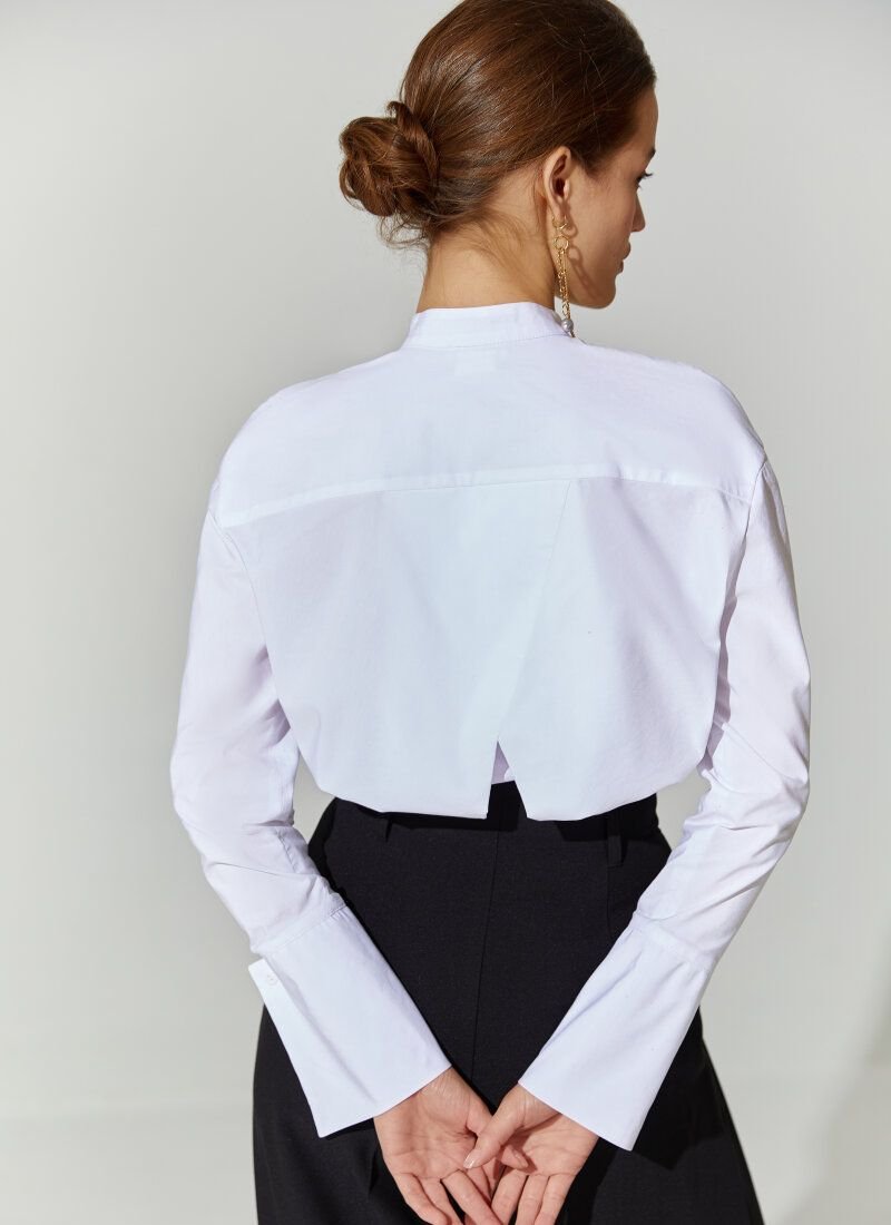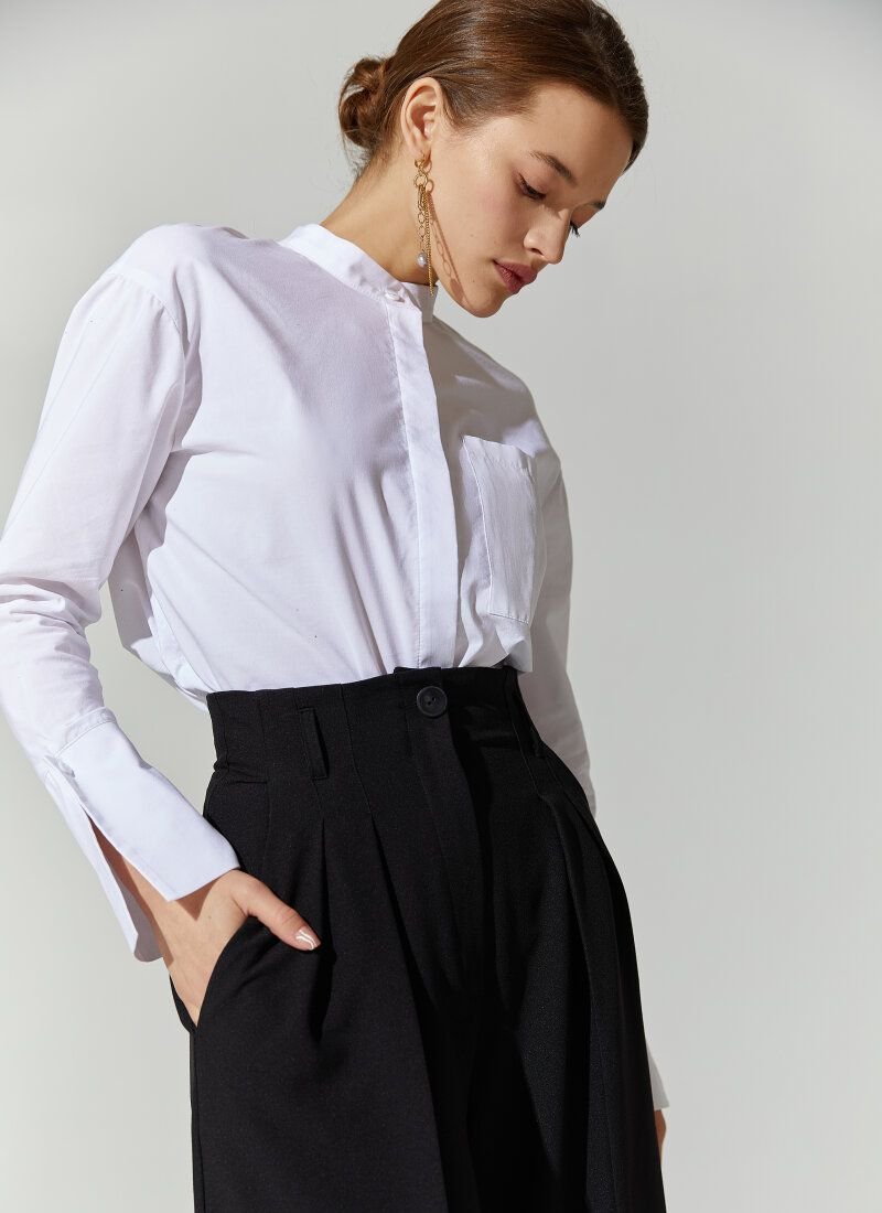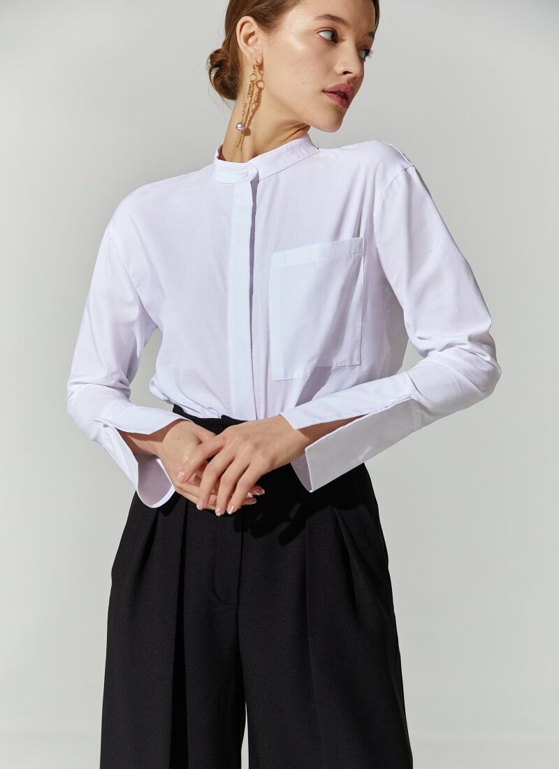 A shirt with a stand-up collar has many advantages. Due to the cotton in the composition of the material, the model passes air well, the free cut does not restrict movement, and the pure white color makes the model a suitable element for images of any complexity. The long sleeves were complemented with wide cuffs with slits. The face of the collection was the winner of "Eurovision 2016", Ukrainian solo artist - Jamala.