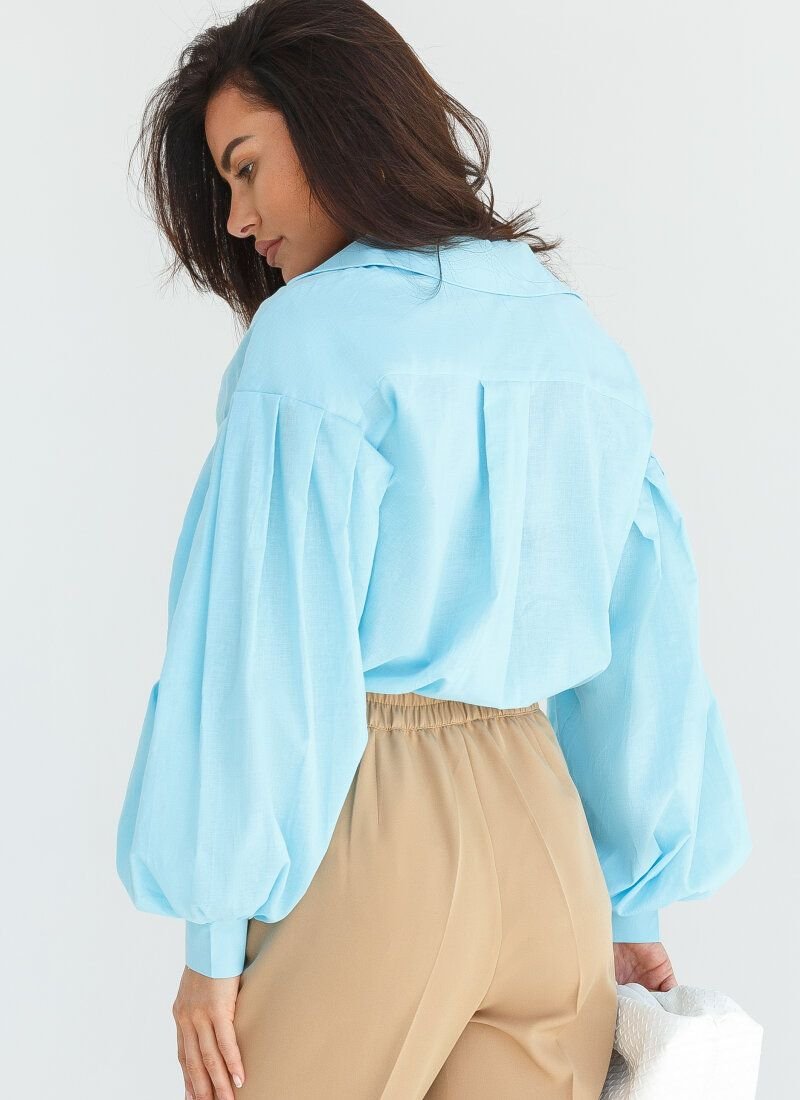 This lightweight shirt is not devoid of femininity, despite the loose fit. The turn-down collar is complemented by a button placket along the entire length. The volume of the sleeves is created by wide pinches on the shoulder line and cuffs. Small incisions are made on the side seams, which round the hem.