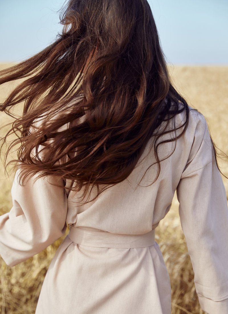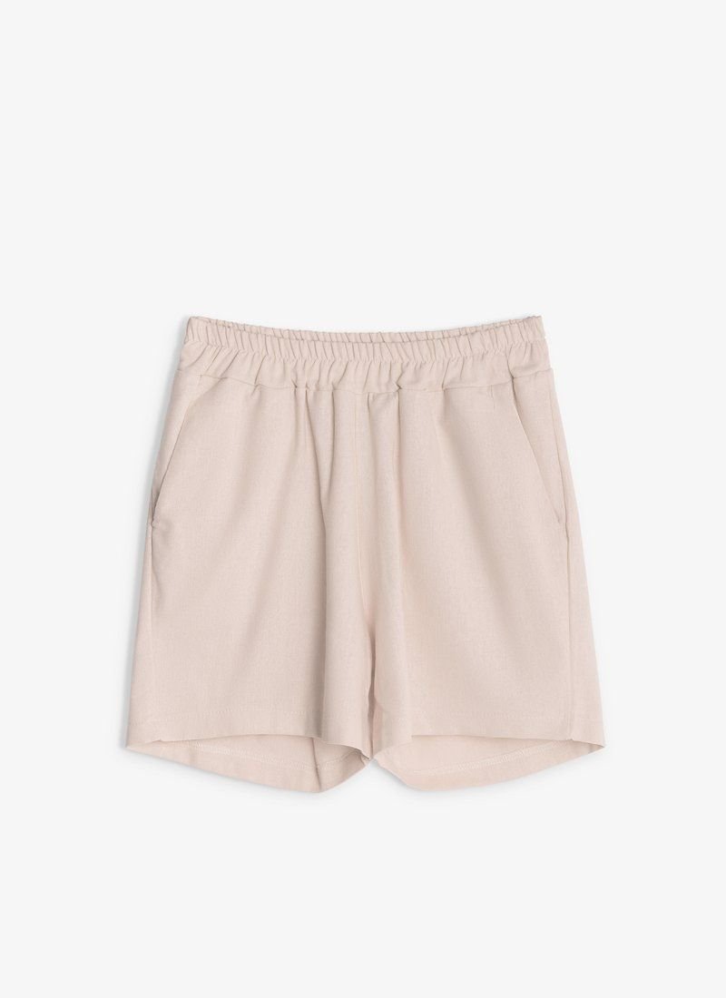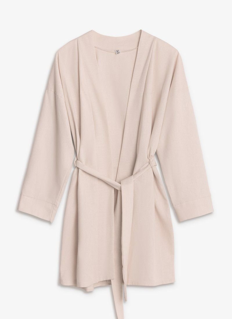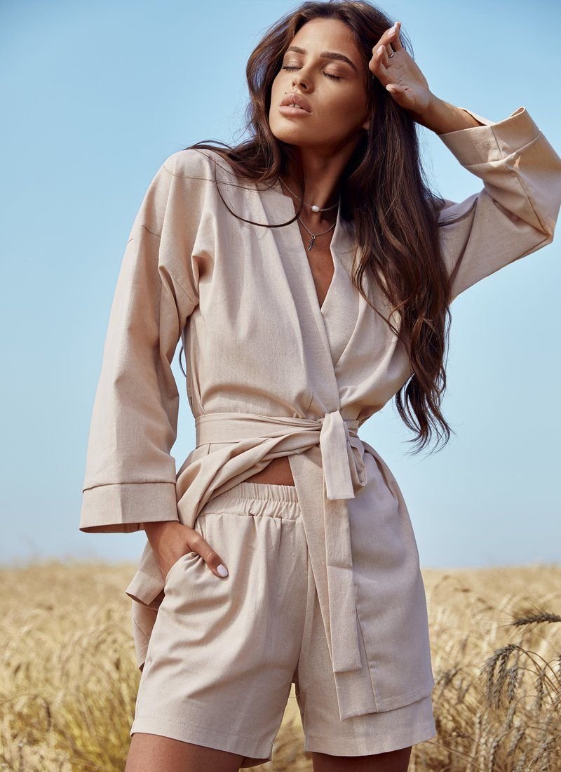Trendy summer suit made of linen. A loose-fitting shirt for the smell and short shorts of medium fit with an elastic waistband. The set includes a removable belt-ribbon to match the suit.