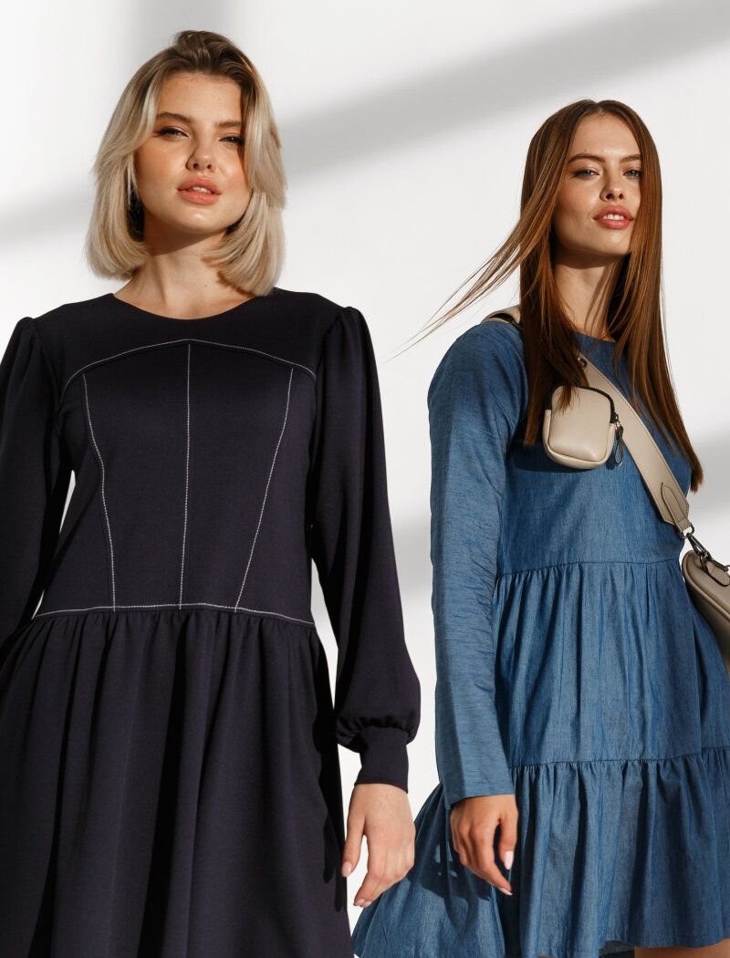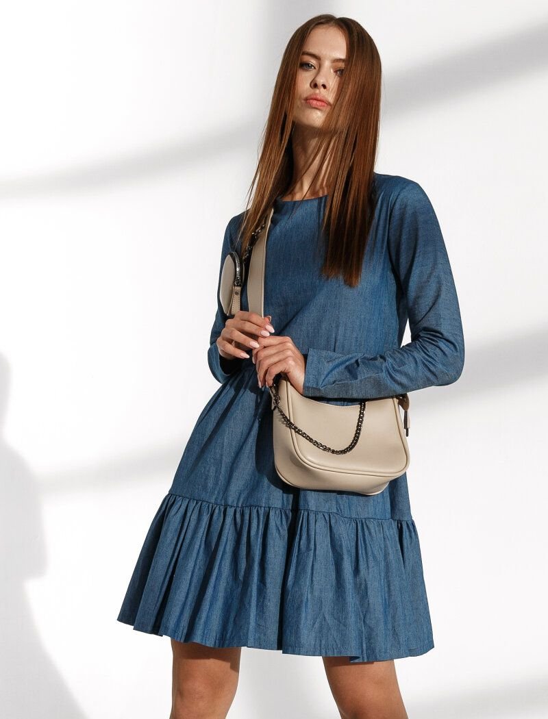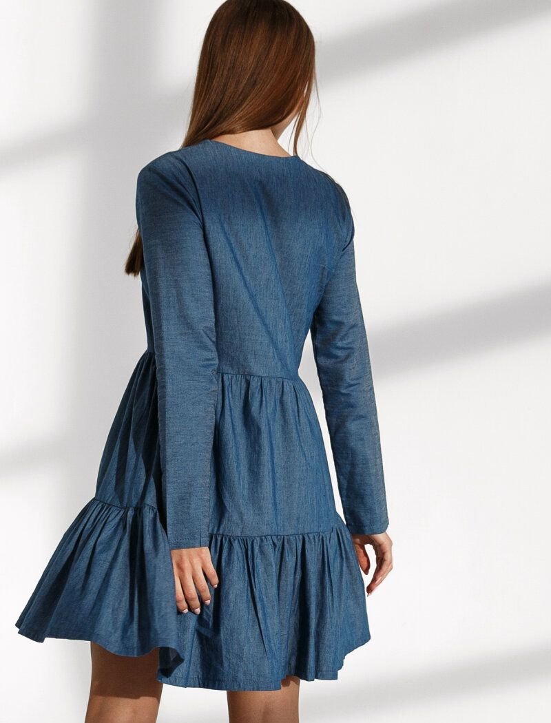 A mini dress made of light denim is ideal for creating a stylish casual look paired with trendy Cossacks. The laconic cut was complemented by a multi-tiered skirt and long sleeves.