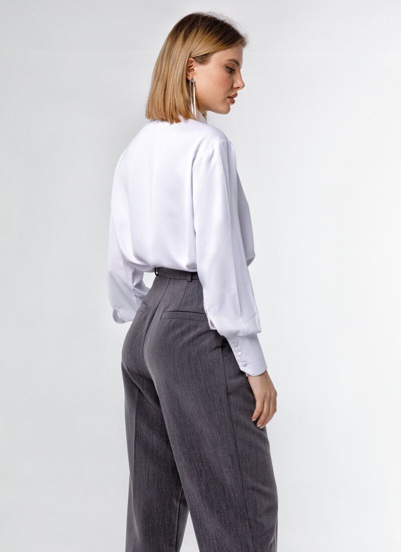 White silk shirt from Gepur designers. The model is complemented by an accent collar in the form of a small bow. The long sleeve is complemented by a cuff. A patch pocket is made on the chest. The collection was presented by Misha Romanova, a solo artist and ex-member of the legendary VIA Gra group.