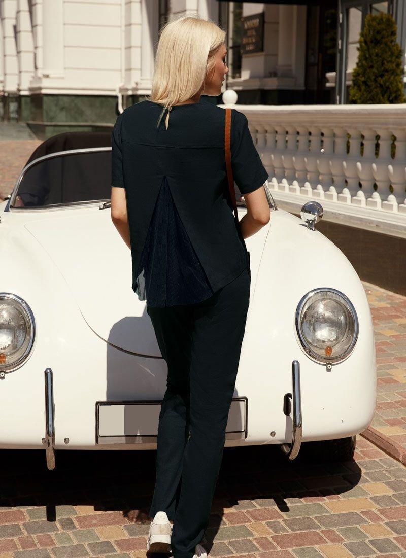 Summer suit made of linen fabric: a loose top with short sleeves and a mesh insert on the back, medium-fit trousers with a fixed lapel, elastic waistband, welt pockets and drawstring ties.