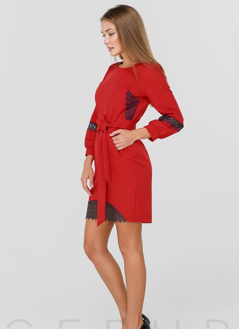 An elegant straight-cut dress made of dense costume fabric with lace trim: a neat round neckline, a long flashlight sleeve with a button cuff, two welt pockets, a small slit slit and a removable belt to match.