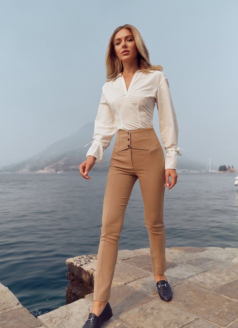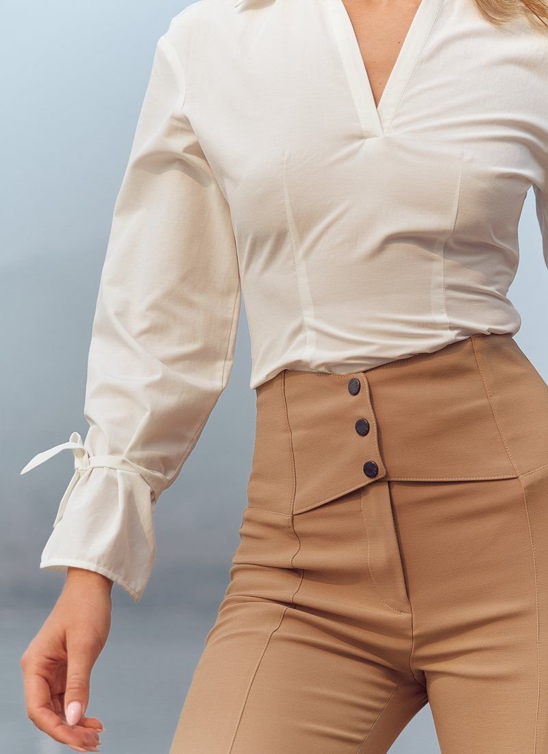 The actual white shirt from Gepur designers is a basic white color. The V-neck on the chest is complemented by a strict stand-up collar. The loose long sleeve is decorated with matching ties that allow you to focus on the cuff. The model is perfectly combined with a skirt and trousers of a classic cut, as well as jeans.
