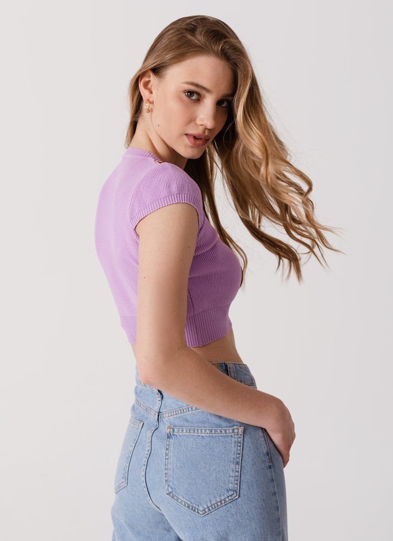 Designers continue the trend of using chains as jewelry. A lavender crop top made of ribbed knitwear was decorated with a golden accessory.